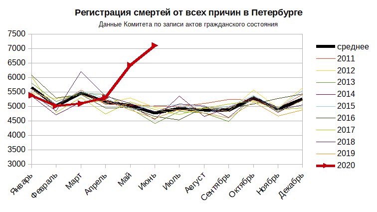во-первых, это график "от всех причин". это ещё не привязка к коронавирусу. во-вторых: хотя рост, конечно, есть, но вертикальная шкала начинается от 3000, а не от нуля. визуально выглядит как рост в 2 раза, но это не так. заготовка для какого-нибудь жёлтого новостного портала.