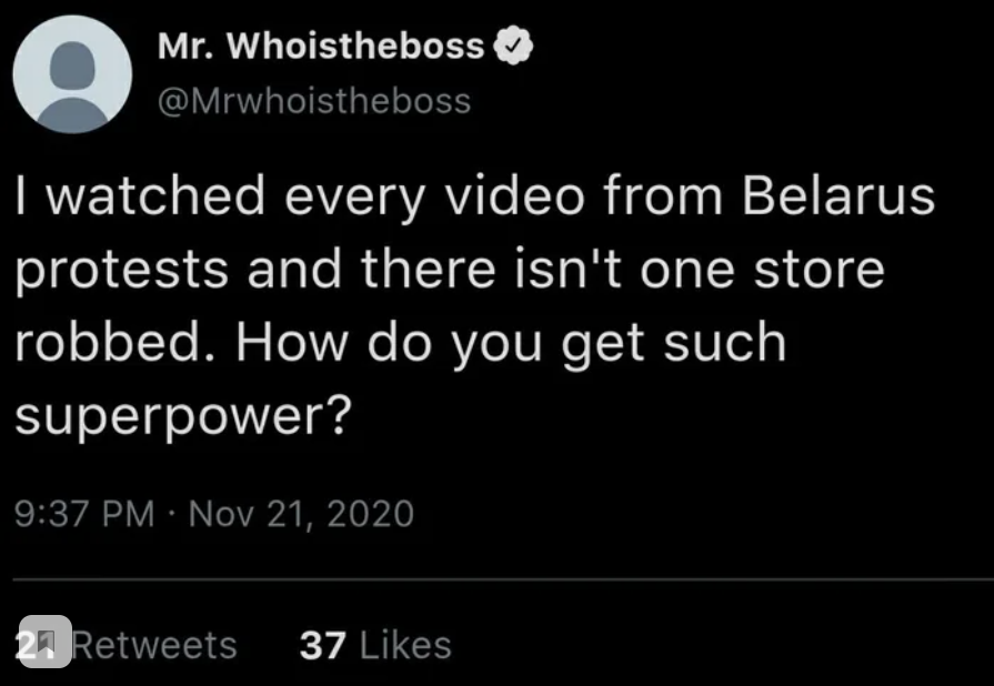 Я смотрю каждое видео с протестами из Беларуси и там не обокрали ни одного магазина.