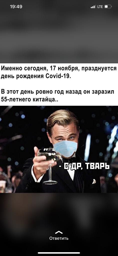 За ноябрь новых заражённых 744, вылечили 837. На сегодняшний день общее количество заражённых такое же как было 23 октября. ХЗ, что они там рисуют... ссылка доступна только зарегистрированным ВОЗ предупреждает: Дед Мороз в этом году может принести в ваш дом не только подарки. - Рабинович, как думаете, почему Роспотребнадзор запрещает россиянам собираться в местах досуга и отдыха, а на рабочих местах - пожалуйста? - Таки, молодой человек! Я вас умоляю... на большинстве российских предприятий такие условия работы, шо коронавирус НЕ ВЫЖИВАЕТ! -------------------- Политики – словно подгузники. Их надо почаще менять. И по той же причине.
