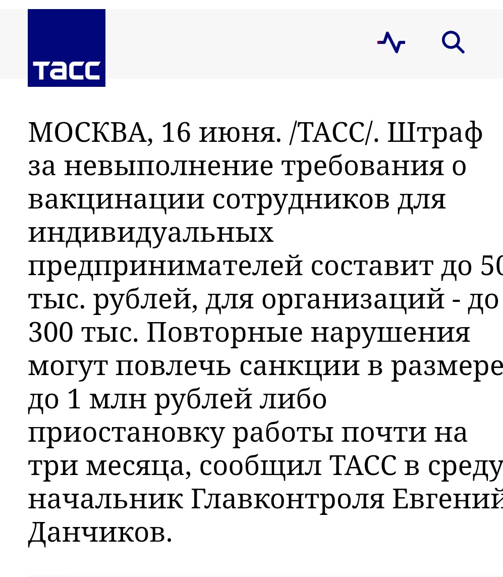 "Обсудили ситуацию с работниками: можем ли мы их отстранить, если они отказываются прививаться. Получили комментарий, что можем отстранить без зарплаты и нас [предпринимателей] наказывать не будут из-за эпидемиологической ситуации", - сказал он. -------------------- Ein Reich, Ein Führer, Ein Internetdienstanbieter!