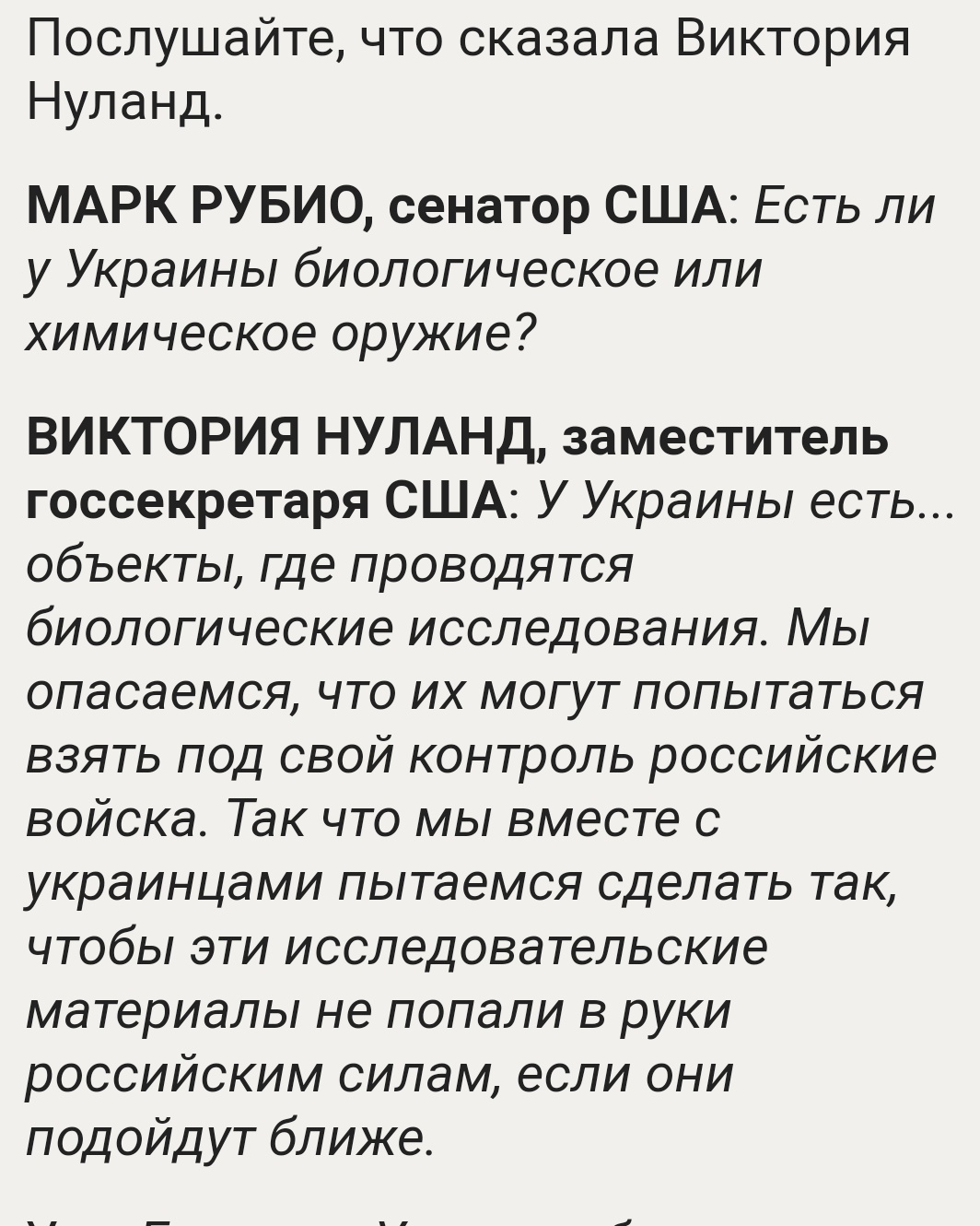 Цитата Минобороны утверждает, что в американских лабораториях на Украине велось изучение «коронавируса летучих мышей». «Согласно документам, американская сторона планировала вести на Украине в 2022 работы по патогенам птиц, летучих мышей и рептилий с дальнейшим переходом к изучению возможности переноса ими африканской чумы свиней и сибирской язвы. В созданных и финансируемых на Украине биолабораториях, как показывают документы, проводились эксперименты с образцами коронавируса летучих мышей. Целью этих и других финансируемых Пентагоном биологических исследований на Украине, являлось создание механизма скрытого распространения смертоносных патогенов» в общем Украина не только Чёрное море выкопала, но и ковид изобрела. -------------------- Разница других исполнителей, которые пытались перепеть эту песню, в том, что они поют как будто идут на войну, а Цой - будто вернулся оттуда.