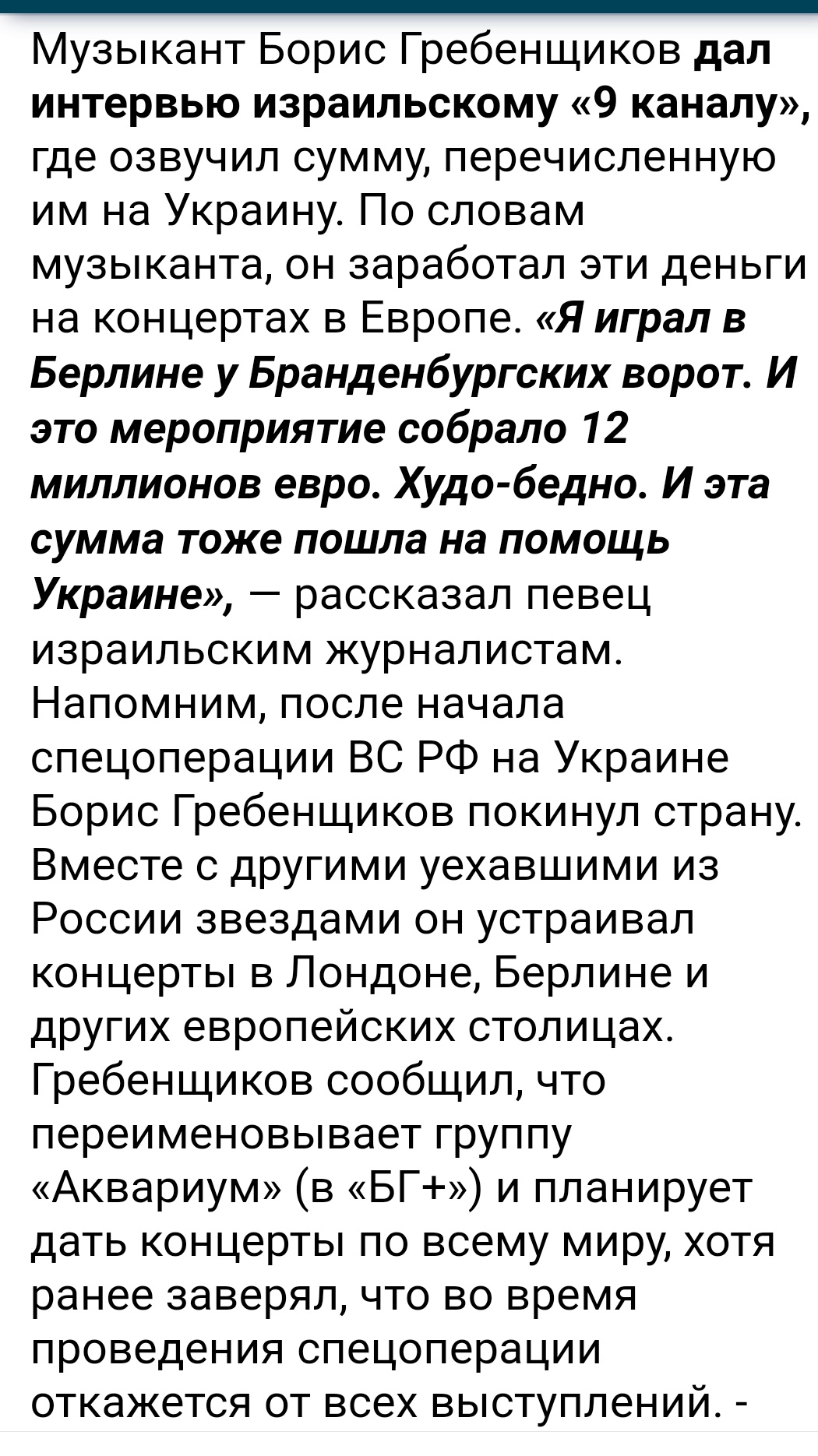 Цитата Но 200 «путинских» миллиардов, о которых писали годами, почему-то так до сих пор и не заморожены. кто писал? фрики типа Банального? это то же самое, что укробайки про то, как "орки" зашили трём детям в животы по фугасу и отпустили в сторону ВСУ. -------------------- Разница других исполнителей, которые пытались перепеть эту песню, в том, что они поют как будто идут на войну, а Цой - будто вернулся оттуда.
