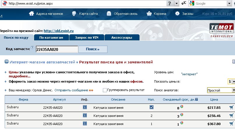 Поспрашивал на Exist'е катушку зажигания и бронепровод. Сказали: "Есть! С тебя ~7000 руб." А потом прислали счет, включающий доставку, на 13300. Я плакалЬ! Мда я както тож хотел кой чо заказать так мне 90$ доставку прилепили., Говорил с менеджером ихним- "Ну вот" - говорит...,А говорю могёт мой друг забрать в Москве? - "неа" мол пусщай регистрируется , заказывает и забирает , щас Вот прикидываю заказик по VIN коду (ну может через месяцок созрею), ну попробую значит товарищу объяснить , не знаю что получится (но с фирмы забирает оплаченый товар без проблем), а там в контейнер ещё 1,5 месяца..,Да ещё не всё будет в наличии, да проценты он берёт (но это с общей суммы заказа, зато отвечает за свои действия)...,Ну вот так могу попробовать помоч , Но долгло это всё будет. да и предоплата не помешает.... -------------------- Почта: maykov@mail.ru ...... icq: 610 723 439 ...... WatsApp 89140319611
