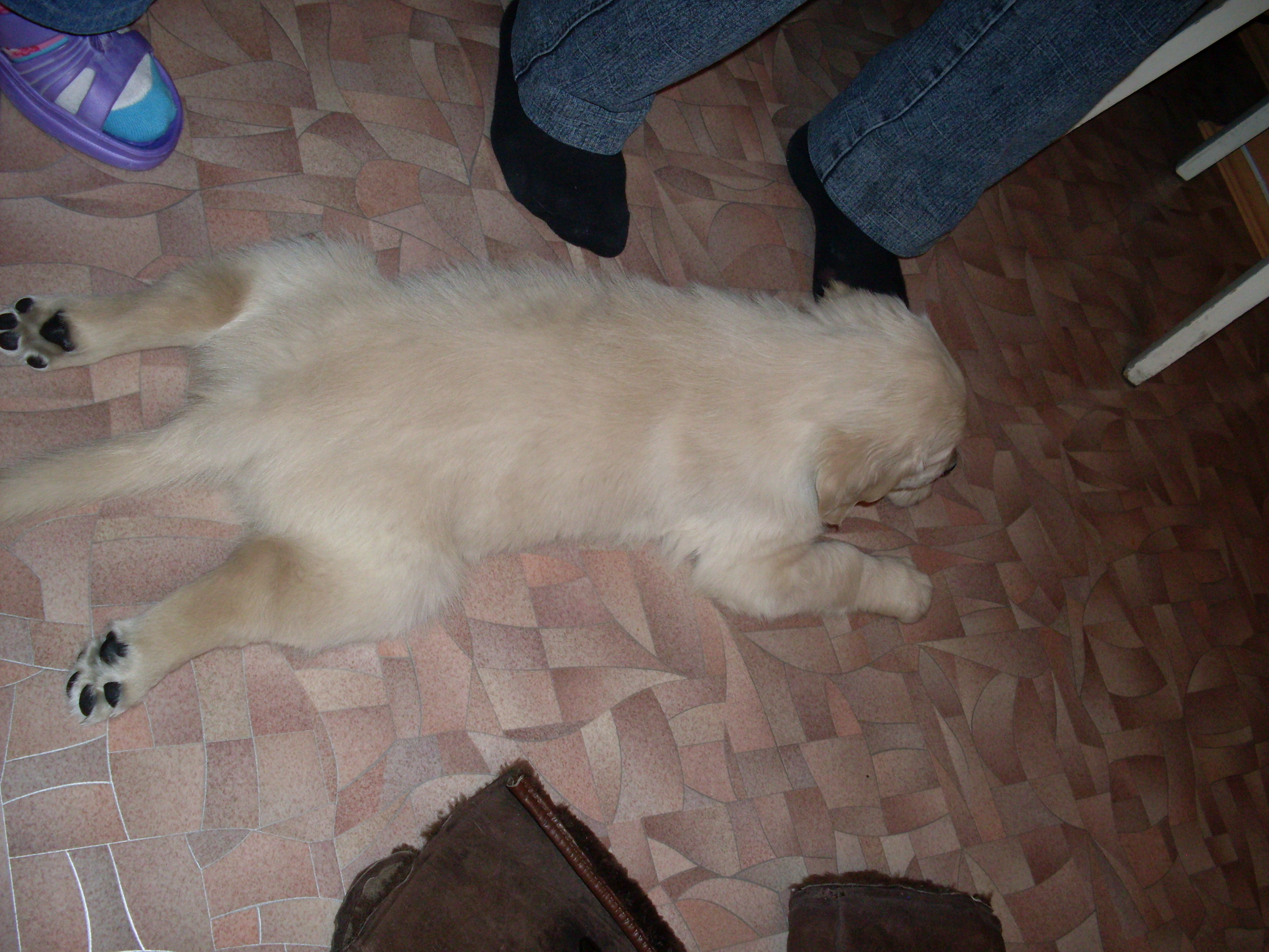 Все лабрадосы так любят делать, наш только так спал на пузе, лапы вытянет так, что фиг переступишь, и дрыхнет