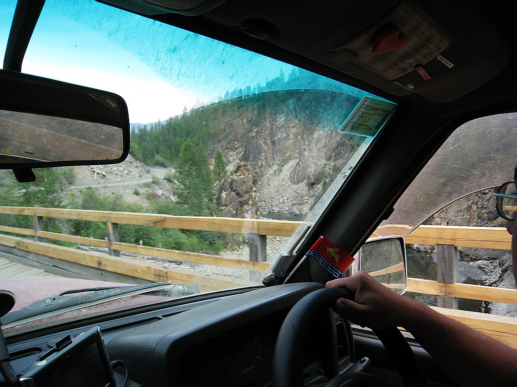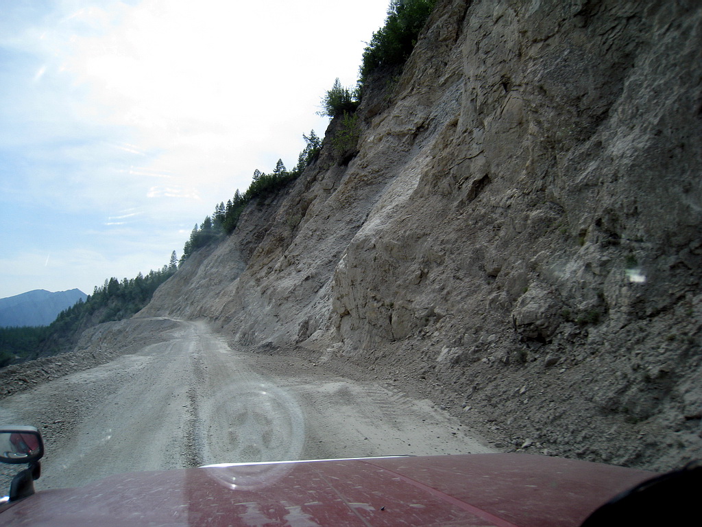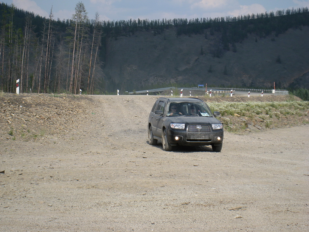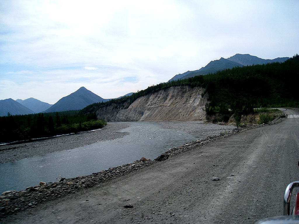 День 4й. Кубюме – Теплый ключ. Проснулись достаточно рано – около 9 утра. Убрали палатку, позавтракали, начали готовить машины: Кстати, все это время – автомобили показывали себя достойно.. Поломок, кроме упавшего на пол-шестого датчика уровня топлива на сафаре – не было.. иногда правда при тряске вела себя подозрительно стрелка тахометра у сафаря же – норовила упасть тудаже.. но пока тенденция эта не развилась. Пока собирались – супруга сделала несколько фото: Отдельно надо сказать о пятом члене команды – собаке по имени Дуся.. Собачка стойко переносила лишения и тяготы путешествия.. но на 4й день сделала вид, что никуда она отсюда не поедет… на руках – затащили в машину, завелись и поехали. Вообще, 4й день обещал быть интересным – мы должны были пройти такие места, как заячья петля, Черный и желтый прижимы, и спуститься с гор в долину реки Алдан. Поехали в общем.. довольно скоро дорога сильно сузилась и в случае чего разъезжаться с какимнить большегрузом было бы сложно.. проехали километров 40 - опять же со скоростью не более сорока км в час подъехали к границам Томпонского района.. (да-да, именно такого) Чуть позже подъехали к метеостанции Восточная. Надо сказать – что в этом месте нет мостов через ручьи пересекающие дорогу… а дорога одна… ручьи по нашем проезду были не большие, сухие, но с крупными валунами – сафарю не страшные, но неприятные для субарика и прочих не очень высоких машин. Подъехали к метеостанции.. решили пообщаться ос смотрителем Димой. Он рассказал, что не дай бог пройдет дождик и данные ручейки станут непроходимыми не то что для нас, но и для большегрузной техники %(… Такая вот федеральная дорога Колыма. Так же Дима сказал, что сейчас –это нормальная дорога, но дальше, особенно на другой стороне Алдана – дорога очень плохая.. и опять же не дай бог нам попасть в дожди.. будет очень тяжело. Попрощались и поехали дальше.. Дорога начала забирать в горы.. начался плавный подъем и очередное сужение трассы. Слева сопка со скальником справа обрыв и наледь огромная. По дороге текут ручьи размывая трассу. Очень неприятное место.. много поворотов вдоль склона сопки, хотя все таки это наверное уже горы. Первое чудо дорожного строительства – урочище «Чертовы ворота». Взорвали специально скалу – что бы провести дорогу. Дальше была заячья петля.. впечатлило.. дорога уходит на лево и резко идет вниз срезким же поворотом направо.. надо очень медленно спускаться… Представляю как там тяжело большегрузам. После спустились в очередную долинку: И подъехали к ремонтируемому мосту без перил.. Наприятно переезжать такие мосты.. кстати – очень много страых мостов… Якутдза в теплом ключе рассказал что в районе уть неры есть мост – постороеный в 1939 году – и до сих пор функционирует.. Ну а мы проехали кюрбелях и опять начали карабкаться в горы.. впереди был черный прижим. Что сказать, словами прижим не опишешь… но впечетлает очень – слишком титанический труд – кайлом продолбить дорогу в скале впечатляет.. к сожалению по дороге туда много снимков не сделали – зато сделали на обратном пути.. когда дойду до обратной дороги – выложу. Вот это фото моста перед заездом на черный прижим: Дорога уходить направо, затем вокруг конусной скалы налево и начинается подъем…. А это фото непосредственно с черного прижима.. внизу течет большая река «Восточная хан