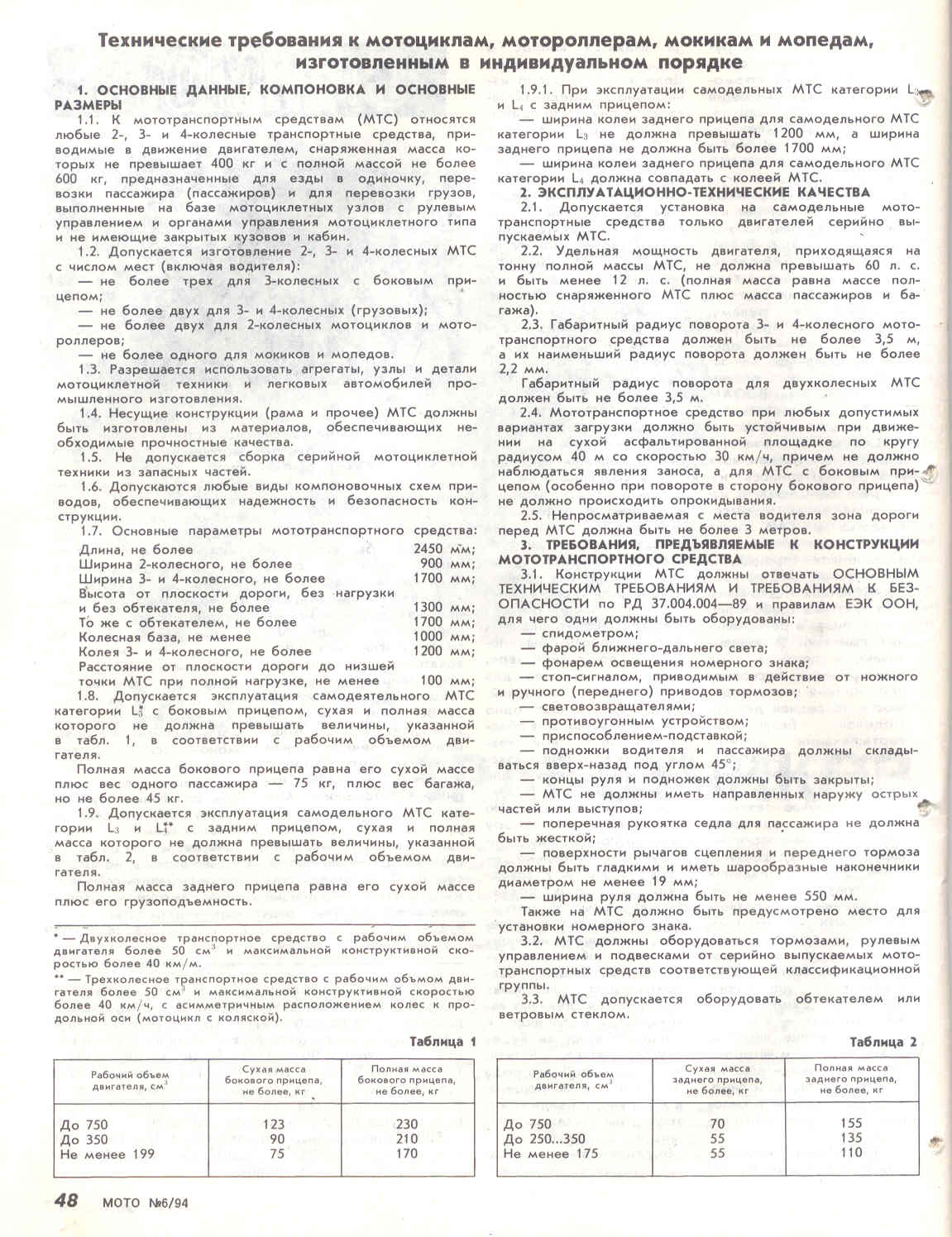 вот кстати и статейка из журнала МОТО №6 за 1994 год: Технические требования к мотоциклам, мотороллерам, мокикам и мопедам изготовленым в индивидуальном порядке.