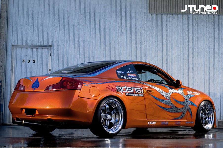 Перевод: Drom.ru Автор: Jason Leung Фотограф: Mike Shin при перепечатке ссылка на источники текста и перевода обязательна Многие считают тюнинг автомобилей образом жизни. Что же заставляет энтузиастов обливаться потом и кровью над своими чадами, вкладывая в них с таким трудом заработанную наличность? Причина у каждого может быть своя, но преданность этому странному увлечению тюнеров объединяет. Сколько бы они не вложили в свое авто, затраты окупаются сполна. Отдать 600 зеленых за сумочку от Louis Vuitton для подружки – означает для меня на время стать нищим, но эта авантюра так или иначе окупится. А вот представьте себе – потратить на свою "вторую половину" $140 000... Для Signal это сущий пустяк. В работе этой компании, основанной в японском городе Осака в 1979 году, деньги не играют большой роли. Главное - статус. Поэтому они и решили приобрести двух монстров от Nissan. Итак, вы видите перед собой два реальных Nissan Skyline, купленных владельцем Signal Auto по имени Коскэ Кида и по прозвищу "MAD". Кида был уверен в том, что привезя в Штаты эти две машины, компания Signal Auto станет еще более конкурентоспособной на соревнованиях. В первую очередь гараж взялся за Nissan Skyline GT-R R34 V-Spec N1 - предстояла задача построить идеальный автомобиль на основе уже и без того яркой машины. Благодаря неограниченному бюджету Signal закончили работу над R34 всего через четыре месяца после покупки. Машина изначально была номером один в своем классе, так что Signal представилась исключительная возможность показать, что у них есть все необходимое, чтобы усовершенствовать этот GT-R. Сначала был разобран и подвержен всестороннему апгрейду двигатель RB26DETT. Все внутренности были предоставлены GReddy: распредвалы 272, клапанные пружины, шатуны, свечи зажигания и поршни. Далее были добавлены эксклюзивный впуск Signal и выхлопная система Tanabe Concept G-Blue. На блоке был закреплен турбо-коллектор HKS с турбочарджером HKS T04R, что обеспечило внушительное увеличение мощности. Компанию мотору составили интеркулер от GReddy, инжекторы 1000 куб.см. от Sard, вестгейт от HKS, система управления двигателем F-Con V-Pro, радиатор от Koyo и буст-контроллер Blitz SBC. Крышку клапанного механизма для пущей красоты хромировали. На колеса мощность успешно передается благодаря секвентальной трансмиссии от Hollinger, дифференциалу повышенного трения Cusco и трехдисковому сцеплению Exedy Carbon. Комплект Tanabe Sustec Pro RR обеспечивает развал колес для выполнения идеального дрифта. Передний и задние стабилизаторы поперечной устойчивости от Tanabe делают ходовую часть дрифт-кара более жесткой. Салон, разумеется, не остался без каркаса безопасности. Кузов GT-R украсил воинственный обвес от Rando, спойлер Signal Auto и модифицированная передняя оптика. Кузов и салон были окрашены в энергичной гамме от Maziora Andromeda. Колеса SSR Type-C черного цвета с резиной BF Goodrich G-Force KD – вот новая обувь автомобиля. Комплект тормозов от Alcon включает в себя 6-поршневые суппорты спереди и 4-поршневые – сзади, а так же тормозные шланги Alcon и колодки Endless. В салоне вы увидите гоночное сиденье водителя Bride Zeta II, переключатели и измерительные приборы Signal Auto, руль Rays и карбоновые панели. Все остальное удалено. Теперь взглянем на еще один Skyline – V35 2003 года. Автомобиль этот сам по себе уникален: во-первых, праворульный эквивалент G35 – это настоящий раритет в Штатах, а во-вторых, этот Skyline вместил в себя 2,2-литровый мотор SR20DET и трансмиссию R33 GT-S. Конс