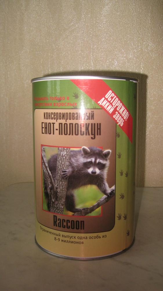 я короче забоела....но очень хочу ...ЕНОТА! по телеку была передача- он ходит на задних лапках, сам моется мылом и кушает ложкой!! в городе продают щенка, 30 тыщ стоит. Кто нибудь его видел? =)) Купили вот енота. Консервированного. Правда при консервации большая часть свойств енота оказывается теряется безвозвратно. Вот что достали |