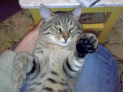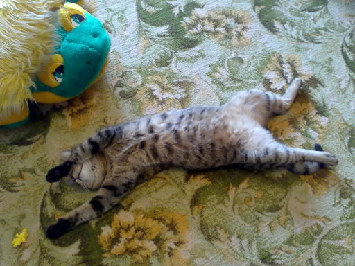 А вот мой любимый котище. Звать его всегда по-разному то Лапочка, то Сволочь, а вообще он Кузя. Мечтала завести чисто черного гладкошерстного кота, нигде не могла найти, а в прошлом году в подъезде нашла вот это "чудовище", ну об окраске тут же забыла.