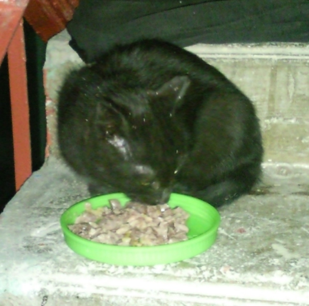 В подъезд на наш этаж подбросили черного котенка, на вид месяца 2-2,5, мне кажется, что это девочка. Не разглядела, потому что вынесла ей/ему еду и котик на нее накинулся. Симпатичная, глазки умные, я ее на руки взяла, погладила - мурчит, как трактор, ласковая такая киса. Вырастет - будет очень красивая кошка.