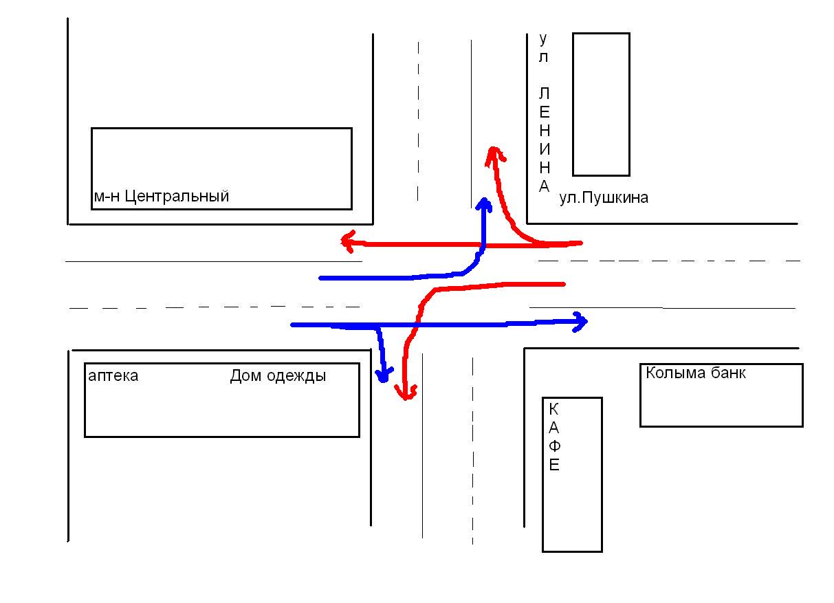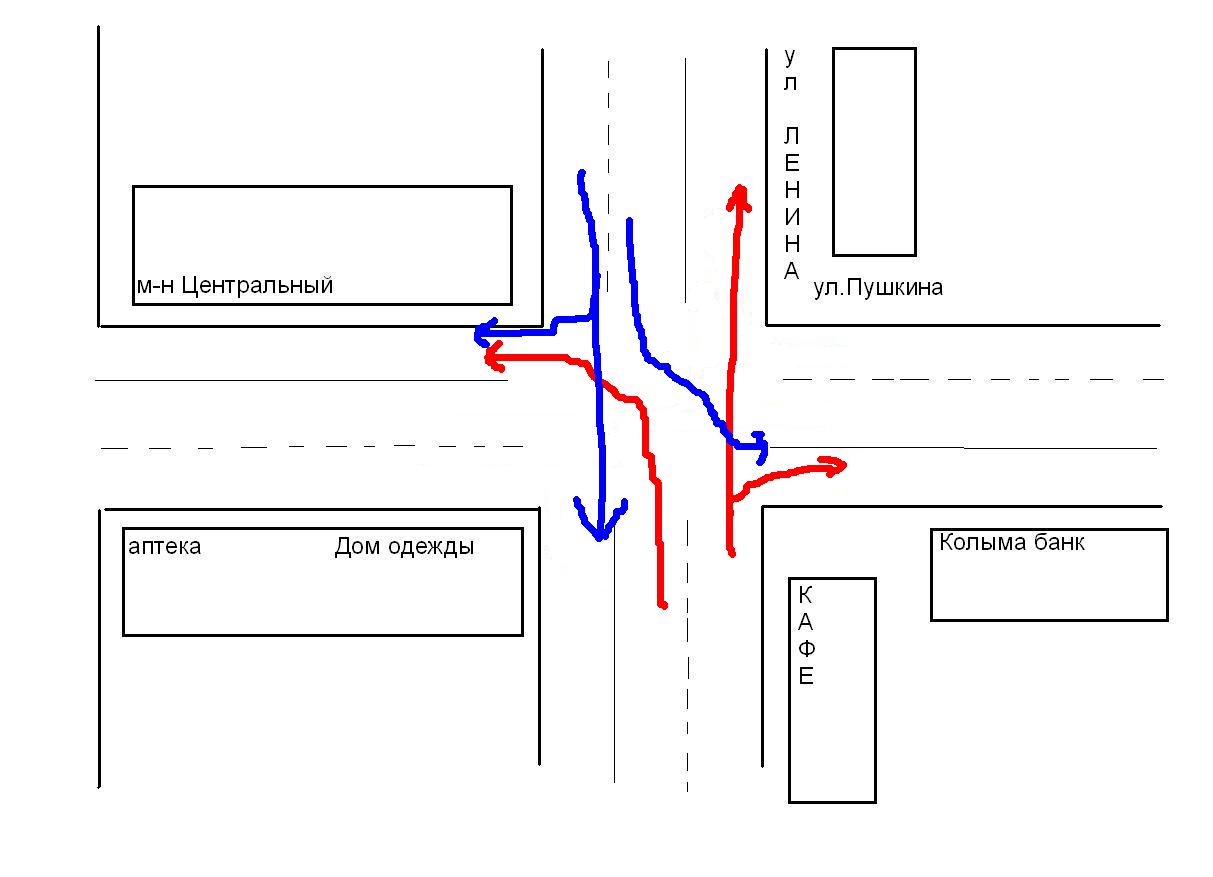 Организовать сбор подписей за изменение развязки перекрестка ул Пушкина - ул. Ленина, предлагаемая схема ниже. Что нужно: Помозговать как будет лучьше всем. Перерисовать приложеную ниже схему в более наглядный ну и красивый вид, сделать ее с указанием знаков и раметки дороги, нарисовать еще несколько схем "вариантов проезда перекрестка" с изображением сигналов светофора. Своять листовку и подписные листы, раздать всем заинтересованным (членам клуба) для сбора подписей всех кто ЗА. Сделать описательную часть с обоснованием изменения развязки на перекрестке с указанием плюсов которые получит город (это могу взять на себя). Направить собраные подписи с "новой" предлагаемой развязкой перекрестка главе муниципального образования города Магадана В.П. Печеному. Ваши предложения? PS Улица ленина соответственно "Главная" - Пушкина "второстепенная". Попутно нужно помозговать с перекрестком возле магазина "Центральный гастроном", "центральной аптекой" и Мэрией т.к. толк будет только если все сделать в комплексе. Кстати выборы не за горами! Нужно торопится!