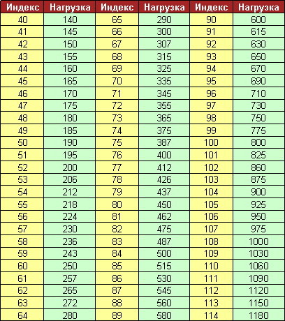 Символ «M+S» или «M&S» (грязь+снег) – зимний рисунок протектора Символ «ALL SEASON» - всесезонный рисунок Символ «REINFORCED» - усиленные шины Символ «REGROOVABLE» - возможность углубления рисунка протектора нарезкой Символ «TUBELESS» (бескамарные шины) Символ «REGROOVABLE» - возможность углубления рисунка протектора нарезкой Символ «STEEL» для шин с металлокордным брекером Символ «ALL STEEL» для шин с металлокордным брекером и каркасом Символ «RADIAL» (радиальная конструкция) Знак направления вращения (в случае направленного рисунка протектора) Так же на шинах указываются символы «Индекс нагрузки (грузоподъемности)» и «Категория скорости» Таблица индексов скорости: Категория скорости - условное обозначение скорости, показывает максимальную расчетную скорость шины. В приводимой ниже таблице указывается эквивалентная максимальная скорость в км/ч. Индекс | J K L M N P Q R S T U H V VR W Y ZR Макс. скор. км/ч | 100 110 120 130 140 150 160 170 180 190 200 210 240 >210 270 300 >240 Таблица индексов нагрузки: Индекс допустимой нагрузки (или индекс грузоподъемности, также называют коэффициентом нагрузки) - это условный параметр. Некоторые производители шин расшифровывают его: на шине может быть написано полностью Мах Load (максимальная нагрузка) и указана двойная цифра в килограммах и английских фунтах. Некоторые модели предусматривают разную нагрузку на шины, установленные на передних и задних осях. Полная таблица индексов грузоподъемности выглядит следующим образом ( ИНДЕКС - индекс нагрузки, НАГРУЗКА - нагрузка в килограммах ). -------------------- ![]() ![]() Сервисный центр "Доралл", ул.Пролетарская, 72 телефон СЦ: 652-300 / сайт : www.dorall.ru Спасибо! — Lonely