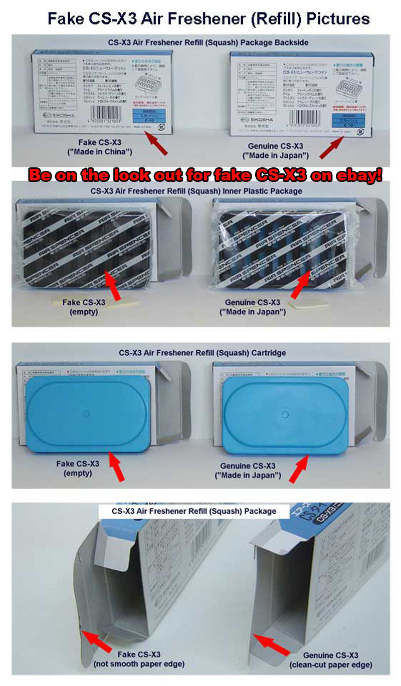 Чем отличается японский от китайского? ***** Вот отличия: 1) В поддельном ароматизаторе наполнитель неплотно закреплен внутри банки, и при попытке потрясти баночку вы услышите характерный звук, подтверждающий это. А происходит это из-за того, что в подделке установлен плохой пластиковые фиксатор мелового наполнителя. В оригинале же фиксатор плотно держит наполнитель. 2) На нижней стороне основной упаковки подделки неправильно указан контактный телефон производителя и имеется фотография баночки без крышки на синем фоне. На оригинале вместо фотографии белый прямоугольник с номером партии товара. 3) На верхней части основной упаковки подделки, а также на ее лицевой стороне, находится фотография ароматизатора без головной крышки, на оригинале же ароматизатор изображен с крышкой. 4) На лицевой стороне основной упаковки и на самой баночке имеются отличия в изображении знака компании и написании логотипа. На подделке используется старое изображение знака и написание логотипа: EIKOSHA ниже Kyoto, Japan, на оригинале: EIKOSHA ниже THE FRAGRANCE COMPANY KYOTO JAPAN. 5) Внутри поддельного ароматизатора находится круглый буклет на японском языке. В оригинале находится квадратный буклет на японском языке 6) И конечно же одной из важнейших отличительных черт является непосредственно запах. У оригиналов запахи приятные и естественные, у подделок запахи резкие, некачественные, часто вызывающие раздражение. ***** |