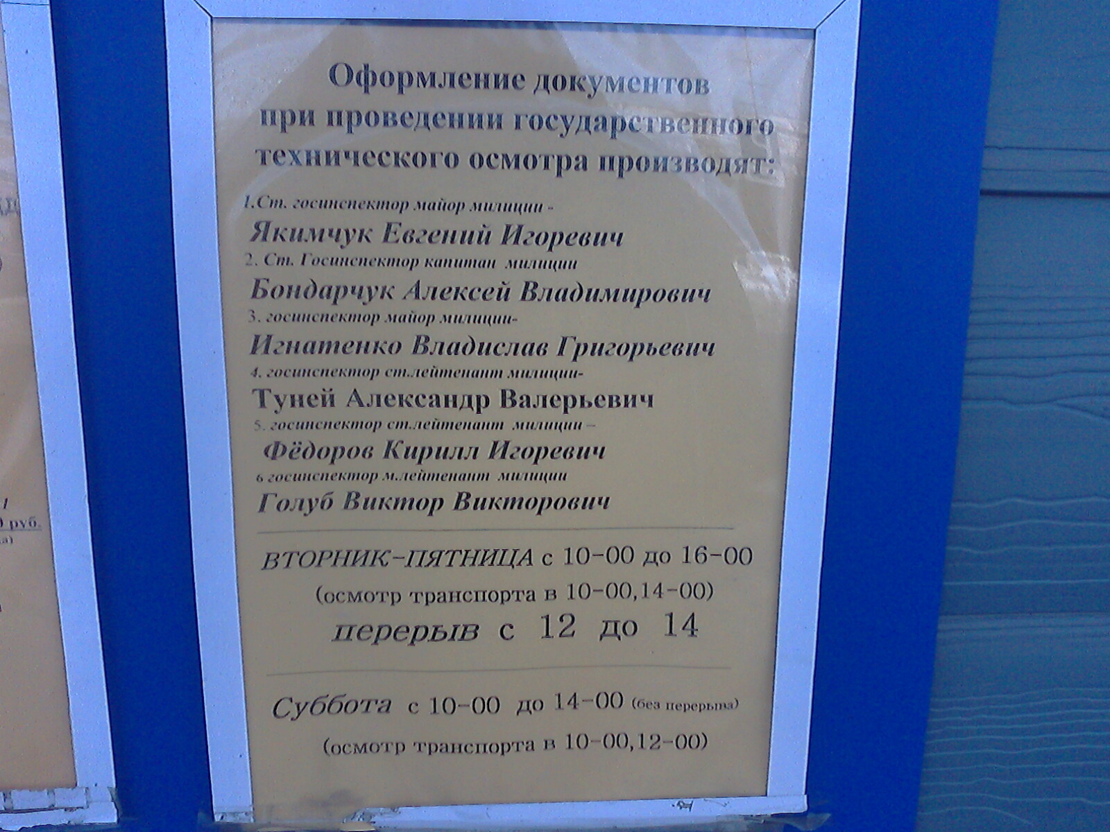 ТЕХОСМОТР на Кольцевой (бывший кит.рынок, поворот направо перед сто МАРС) вторник, среда, четверг, пятница с 10:00 до 17:00 суббота с 10:00 до 15:00 перерыв с 13:00 до 14:00 воскресенье, понедельник-выходной. тел. 65-72-46 ТЕХОСМОТР зао сто "Машиностроитель" (ул. Транспортная,3) вторник, среда, четверг, пятница с 9:00 до 17:00 перерыв с 12:00 до 14:00 суббота с 10:00 до 14:00 тел. 63-11-49 Владелец исправного ТС предоставляет для получения талона технического осмотра инспектору ГИБДД следующие документы (после проверки номерных агрегатов):