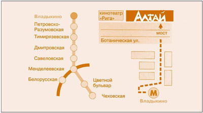 127106, Россия, Москва, Ботаническая ул., 41. Метро «Владыкино» Информация: +7(495) 221-81-86 Служба бронирования: Тел.: +7(495) 482-2797.482-57-03 Факс: +7(495) 221-81-83 E-mail: altaybook@gmail.com -------------------- С любимыми не расставайтесь (с)