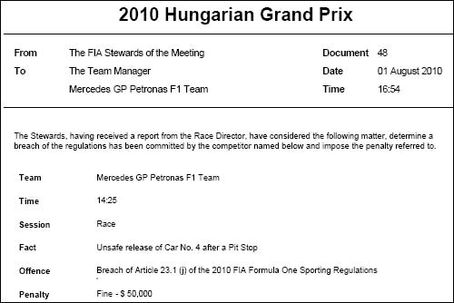 Стюарды оштрафовали Renault и Mercedes…01/08/2010…FIA