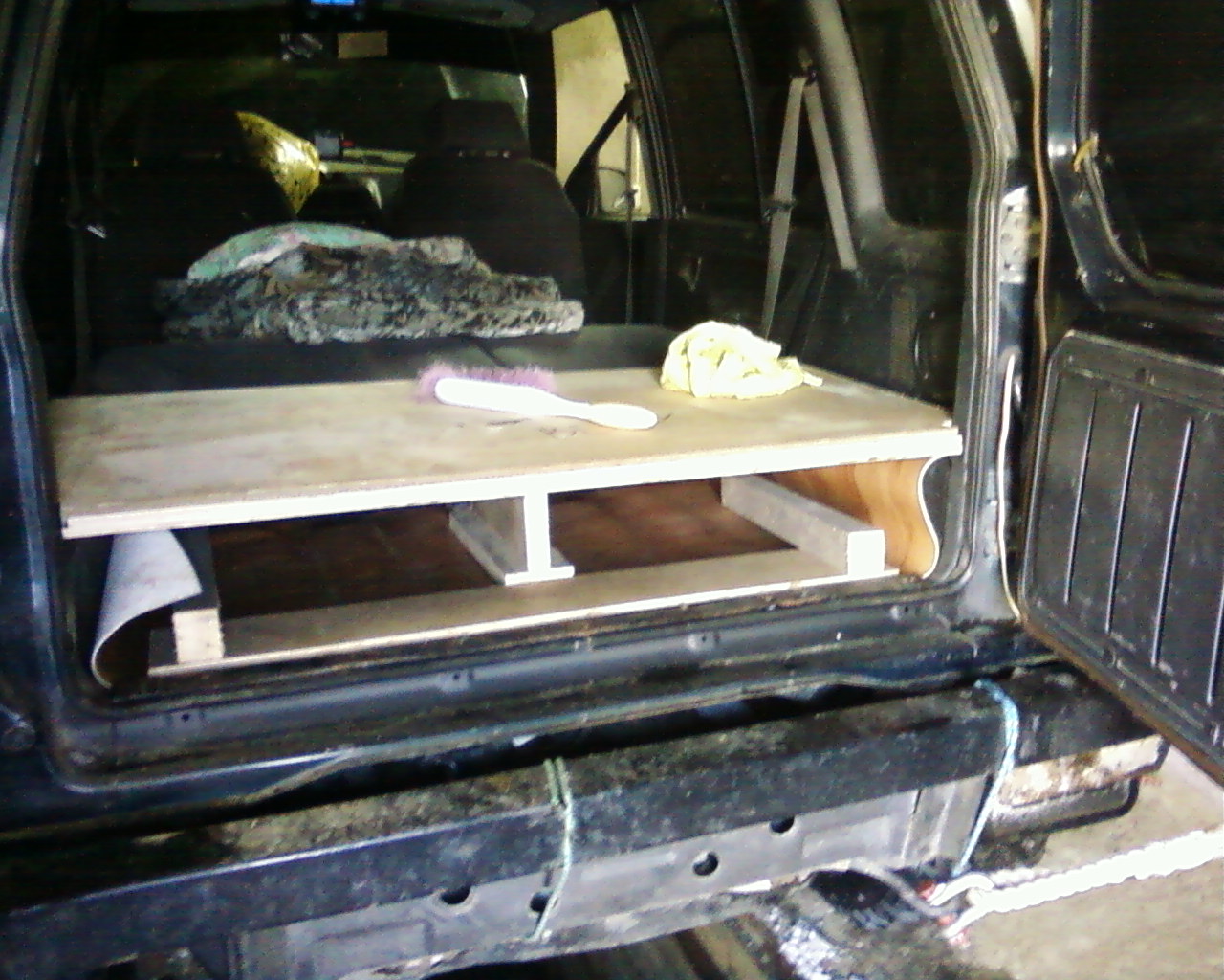 Так как регулярно приходится выезжать за пределы города (рыбалка, охота и.д.) и ночевать в машине, решил я сделать спальное место в своем авто, т.к. на сиденьях спать не очень удобно (при этом задние сиденья снял вообще). Вообщем сварил рамку из трубы профильной 20Х20, покрасил, прекрепил к кузову (чтоб не прыгала) сверху сделал настил из фанеры (10 мм). Насил сделан из двух частей: 1-я часть прикреплена шурупами у металической рамке, а вторая часть ложится сверху. При необходимости ночлега, вторая часть настила устанавливается между рамкой и креслами авто (заранее отодвинутыми до упора вперед и сложенных также вперед). Таким образом получаем спальное место в полный рост. Обшиваем для эффекта фанеру тканью (я обшил кавролином прорезиненным) и усе. При этом имеем нижне отделение для хранения инструмента, и т.д. Кстате сидя ехать при сложенной конструкции также можно.