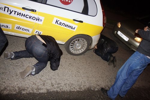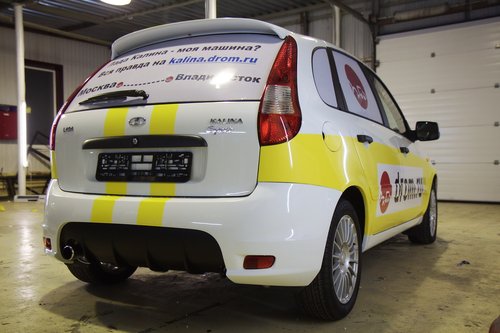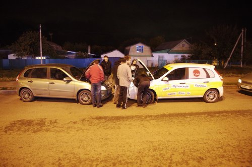 На сегодняшний день пройдено чуть более 2000 км. Калина едет! По трассе она идет очень неплохо — приятная приспортивленная подвеска, отсутствие сверчков в салоне, радует пакет опций и расход топлива. Но шумно, конечно. Запаслись всякой всячиной. Перед выездом нашли открутившийся болтик. Вроде бы некритичный, для массы. Вывалился из отверстия сверху. Прикрутили обратно. Нет одного крепления держателя капота (справа). Одновременно включены антирадар, навигатор и инвертор для зарядки ноута и телефона. Приборная панель Калины. В точности соблюдая инструкцию по обкатке, первые 500 км мы ехали со скороfстью не более 90 км/ч, а сейчас едем не более 110, и так будет до пробега 3000 км. Пробег 500. Наконец-то можно разогнаться выше 90! У нас есть антирадар и навигатор — незаменимые вещи в такой дальней дороге. А вот так видно через заднее стекло (многие интересовались, как можно ехать с залепленным задним стеклом). Если присмотритесь, увидите буквы. По дороге, переполненной фурами, ехать грустно. Хорошо, что в данном случае это не в нашу сторону. В режиме городской езды по неровным дорогам есть проблемы — описанный ранее гул не ушел, плюс опять же на медленном ходу прибавился какой-то новый звук от подвески — ощущение, как будто лежишь на водяной кровати, и она так протяжно глубоко побулькивает под тобой. Посмотрим, что скажут на СТО. Заехали на шиномонтажку — давление было 1.5 вместо 2.0, мы не удосужились проверить это сразу Проблемы с температурой на трассе нет, она стабильно держится чуть ниже 90 — Карлсон работает На текущий момент пройдено три города — Казань, Уфа и Курган. Фото-репортаж: Перед выездом с Москвы. Поймать нас успел только Алекс(ДВ) (слева). Встречи с форумчанами: в Чебоксарах... ...в Казани... Казань — идет сравнение двух Спортов. Казанский Кремль. Мечеть Кул Шариф в Казанском Кремле. Офигенная архитектура. ...в Набережных Челнах... Женя white bear все-таки испортил нам заднее стекло ...в Уфе... Торжественное вручение эксклюзивных сувенирных номеров Дрома Евгению white bear (Уфа). Полтора года обещали... Памятник Салавату Юлаеву в Уфе Максим с ЛКК(лада калина клуб прим. polosatiy) пропилил 70 км на встречу с нами под Челябинском ...в Кургане. Курган. Очередной город на карте! Тест-драйв у Володи в деревне под Челябинском. Мы не поехали в Екатеринбург, так как в Кургане нам пообещал обеспечить первое ТО известный дромовский форумчанин Алексей Antropoff. Он сам ездит на Ладе и работает инженером по гарантии ВАЗа! (привет тем, кто по старинке привык считать Drom.ru сайтом праворульщиков). Нам тут писали, типа это нечестно — ТО надо проходить не по знакомству, а по-простому, испытав все прелести русского сервиса и отношения. Но, во-первых, с такими наклейками обычный сервис уже вряд ли получится, во-вторых, нам ехать далеко и долго, и хотелось бы быстро решить проблемы, а не зависнуть в Кургане, в-третьих — Алексей обеспечит фотосъемку процесса и честные профессиональные комментарии о состоянии машины. В-общем, сегодня утром Калина отправилась на первое ТО, которое надо пройти с 2 до 3 тысяч км. План свести встречи в городах к минимуму, похоже, провалился В Калине мы даем посидеть и немного прокатиться всем желающим. Как правило, владельцы Калин отзываются хорошо, владельцы иномарок — некоторые говорят, что едет неплохо, некоторые — что хреново. Внешний вид нашей Lada Kalina Sport, в принципе, 