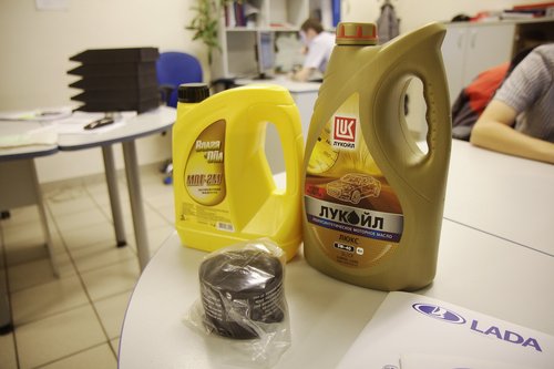 Две тысячи двести восемьдесят три километра пролетели быстро — за три дня путешествия, и вот мы уже отправились к дверям курганского дилера АвтоВАЗа. Сервис для ТО-1 выбирать даже не пришлось — наш форумчанин Алексей Antropoff работает в местной «Ладье» инженером по гарантии, он звал нас на проверку с самого начала пробега. Помимо регламентных работ, предполагалось устранить следующие заявленные неисправности: Гул сзади. Писк спереди. Неправильная работа стеклоомывателя. Неисправный дистанционный ключ, неактивированный иммобилизатор. Работа магнитофона после отключения двигателя. Отсутствие крепления упора капота. [attachment=68239:211976.jpg] В теории, маленький ключик с красной меткой нужно хранить дома и никому не показывать, но в Москве нам про это никто ничего не говорил. Про неработающий иммобилизатор и дистанционный ключ тоже молчали. Помыли машину, и началось... Сложилось впечатление, что мы в вазовский сервис приехали на Феррари — посмотреть на диковинный «спорт-кар» подошел чуть ли не каждый сотрудник ремзоны. Народ внимательно изучал особенности авто, дивился, спрашивал про особенности комплектации. Из-за этого повышенного внимания к нашему скромному хэтчбеку процесс ТО-1 затянулся [attachment=68240:212182.jpg] Все по технологии, вытяжка для выхлопа. [attachment=68242:211978.jpg] Сотрудники сервисного центра изучают особенности спортивной комплектации. [attachment=68243:211980.jpg] Поглядеть на Спорт пришел даже местный дворник (слева в кепке [attachment=68244:212180.jpg] К осмотру подтянулись и менеджеры Загнали машину на подъемник, дабы зрители воочию лицезрели спортивную подвеску. [attachment=68245:211982.jpg] Калине достался первый подъемник — спасибо Алексею, так фотографировать было удобнее. [attachment=68246:211984.jpg] «Да зачем же они ее так крепят?» (с) кинофильм "Формула любви". [attachment=68247:211986.jpg] Защита смотрится внушительно, но по факту — очень тонкая. На дороге к Омску пробивались с ее помощью через щебенку, надо будет глянуть, что там осталось. [attachment=68248:211988.jpg] [attachment=68249:211990.jpg] Два крепления бампера отсутствуют. [attachment=68250:211992.jpg] Передняя подвеска. [attachment=68251:211994.jpg] Задняя зависимая подвеска. [attachment=68252:211996.jpg] Выхлопная трасса неплохо смотрится на черном фоне. Пока не ржавеет. [attachment=68253:211998.jpg] Фирменная насадка, есть даже логотип АвтоВАЗа. [attachment=68254:212000.jpg] Тот самый колдун [attachment=68255:212002.jpg] Пластиковый бензобак впервые стали использовать на Калинах. Впервые на АвтоВАЗе, естественно. Для начала разобрались с регламентными работами — заменой масла и фильтра. В соответствии с первой заповедью маслодегустаторов («Тойоте — тойотово, Хонде — хондово»), решили залить в вазовский 16-клапанник что-нибудь российское. Т.к. фирменного АвтоВАЗовского масла не нашлось (и не факт, что оно вообще существует), то выбрали Лукойл — полусинтетика 5W40. Фильтр — Салют, произведен в г. Самаре. [attachment=68256:212005.jpg] Набор для ТО-1 [attachment=68257:212009.jpg] Промывка двигателя с точки зрения маслодегустатора — злейшее зло. [attachment=68258:212007.jpg] Масло вроде как довольно прозрачное. Говорят, с завода идет с пемзой. После слива старого масла почистили двигатель промывочной жидкостью МПТ-2М от Волга-Ойл. На мой вопрос «Зачем промывка?» привели следующие доводы: — база и пакет присадок у масел разные; — согласно разведданным, на заводе в масло добавляют пемзу, ибо обкатка. Ну да ладно, надо промывать — значит надо. Пройдемся по списку заявленных пробл