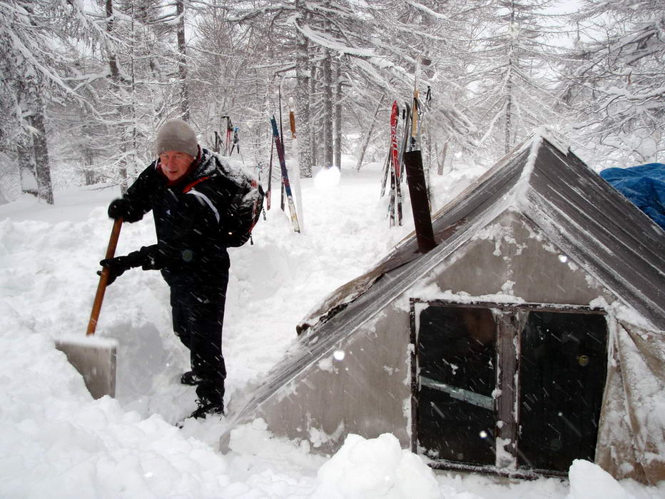 Не смотря на ночной декабрьский дождь, собрались и выехали из города в 10. Под Арманским перевалом второй день стабильные -2. По ходу движения повалил плотный снег и основательно начало задувать с гор. Решили далеко не ходить, а докапать "Приют Лето" и починить продавленный снегом сектор крыши над печкой.
