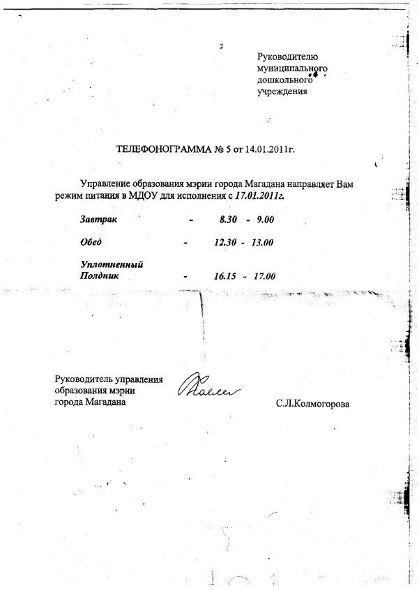 Мэрия г. Магадана Печеному В.П. _____________ Губернатору Магаданской области Дудову ... ________________ Главному санитарному врачу... Онищенко... ______________ Уважаемый.....! К вам обращаются жители г. Магадана. Наши дети посещают муниципальные дошкольные образовательные учреждения г. Магадана. С 01.01.2011 питание в детей в ДОУ регулируется Постановлением Главного государственного врача РФ Г. Онищенко от 22 июля 2010 г. N 91 "Об утверждении СанПиН 2.4.1.2660-10 "Санитарно-эпидемиологические требования к устройству, содержанию и организации режима работы в дошкольных организациях". Данное постановление устанавливает, что в ДОУ с 10-часовым пребыванием детей организуется 3-разовое питание: завтрак, второй завтрак, обед, полдник. При этом норму белка на одного ребенка в день сократили на 10 грамм. Сейчас дети на полдник в 15.30 получают 15% суточной нормы пищи, фактически это 150 - 200 грамм напитка и одно печень, вафля, булочка массой 11 грамм. Однако такая схема питания в ДОУ представляется не соответствущей потребностям детей, категорически не устраивает нас как заказчиков муниципальных услуг и не учитывает климатические особенности нашего региона. Большинство детей покидает ДОУ в 18.00 часов, с последующем посещением учереждений дополнительного образования, будучи по сути, голодными. На основании вышеизложенного, учитывая то, что режим, предложенный новыми СанПинами являтся рекомендованным, просим рассмотреть вопрос о пересмотре распределения суточной каллорийности питания усилением полдника за счет введения горячего блюда. От себя: разрабатывать меню и считать калории мы не обязаны, это должны делать специально обученные люди. Три письма в три адреса с подписями жителей г Магадана, категорически рекомендую не указывать номеров ДОУ - навредите персоналу. |