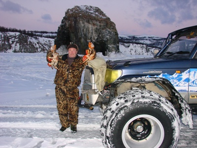 Привет всем!!!! Вот мы и вернулись.Ну,что дороги которую мы били неделей ранее практически небыло,изредка проскакивал силуэт заструганной бровки,подъем на Адыкчан полностью был засыпан,только впереди нас был свежий путик,который пожалуй только мешал искать старую дорогу,движение замедлилось хотя и больших траблов небыло,далее тундра легко до 4 нупа переодически проскакивала старая дорога,после домика подъем.Сначало все хорошо,но где-то после средины все сравняло хотя лебедкой и не пользавались пришлось на первой передаче ползти до верха И так практически на каждом подъеме,после 5 нупа было легче хотя переметов хватало.Подъехали к бухте в 6 утра по пути собрав несколько курапаток немного покимарили и на лед! Первая машина на льду боязно,доехали до трещины штурман забурился,лед гдето см.40,можно смело ехать,направились в сторону камня,но решили попробывать новое место и зря,целый день потярян,всего 4 краба,погода прелесть тепло,как в апреле единственный минус на льду вода,лед весь ровный одинаковой толщины от 40до 50см.Переночевали,утром переехали на камень и прцес сдвинулся,краб начал ловиться Смотальсь к бригаде посмотреть,что ловят,около берега стоят вентеря наваги валом любого размера,а в море дальше ставили сетки по тихой корюшка попадалась,за день полтора,два мешка,само собой людей никого!!! Но надо и домой собираться,на море было относительно тихо,но вьехав в лес началась низовуха,которая просто сравняла дорогу,которую мы пробили два дня назад,опять начали щупать дорогу,с бухты выехали в 18-00 домой приехали в 2-00,усталые,но довольные сезон открыт УРА!!!!!!!