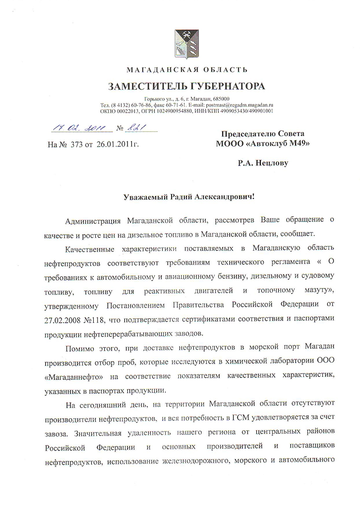 Нужно отобразить в письме: 1) Как проводится анализ топлива: качественно или тяп-ляп (за деньги) Есть ли возможность поучаствовать в выполнении анализа? Дело в том, что по своему роду деятельности зачастую приходится сталкиваться с тем, что производитель заявляет качество своей продукции на высоком уровне, даже есть подтвержденные сертификаты (международного значения). Попытки проверить качество в независимой международной лаборатории приводит либо к отказу с их стороны, либо...результаты гораздо хуже. Для топлива достаточно поприсутствовать и посмотреть методику проведения анализа - соответствует ли она утвержденной? В нашем регионе может наблюдаться сродство поставщиков топлива и лабораторий, тем более нет конкуренции. 2) Анализ топлива включить не только поставщиков, но и продавцов (конкретные заправки лучше периодически). Загрязнение может произойти в процессе хранения топлива: неправильные условия, целенаправленно и т.п....Опять же конкуренция маленькая в регионе. 3) Почему, "заботясь" о развитии Дальневосточного региона, Правительство РФ не идет навстречу: нет льгот для региона по закупочной цене и т.п.? Нас не так много тут проживает. И с каждым годом становится все меньше. Просто выгодно "кому-то" регулировать цены и тарифы на топливо. 4) Ну это нерезонный вопрос)) Мне кажется сомнительным оптовая цена топлива (такая высокая), что создает совместно с транспортной составляющей действующую цену... На материке недавно стало выгодным практиковать продажу всего топлива по Х рублей - акции. В Красноярске в эти выходные на сибнефти X=15 рублям за литр. P.S. Ну и не забывайте, что топливо закупается в кг), а продается в литрах... -------------------- Каждый сам выбирает свой путь