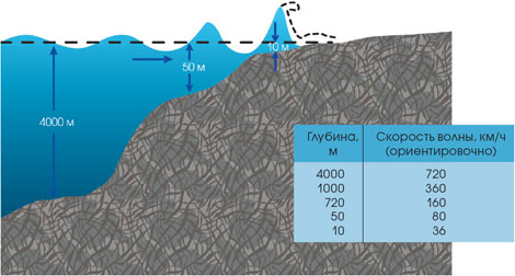 И лишь только на подходе к берегу, где малая глубина, происходит образование приливной волны большой высоты. У цунами появляется "опора под ногами" в виде дна и она уже начинает свой рост -------------------- 89148508740