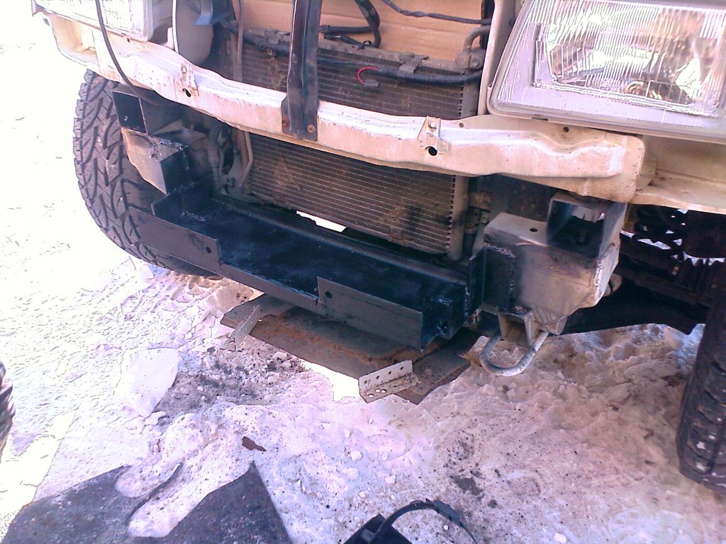 Сегодня весь день провозился с корзиной, всё крепил на сварку,усиливал уголками. Родной бампер снизу подрезать пришлось, а в итоге рычажку переключения размотки на лебедке мешает бампер и незнаю что делать.Пока поставил только кенгурятник, придется железный бампер конструировать...