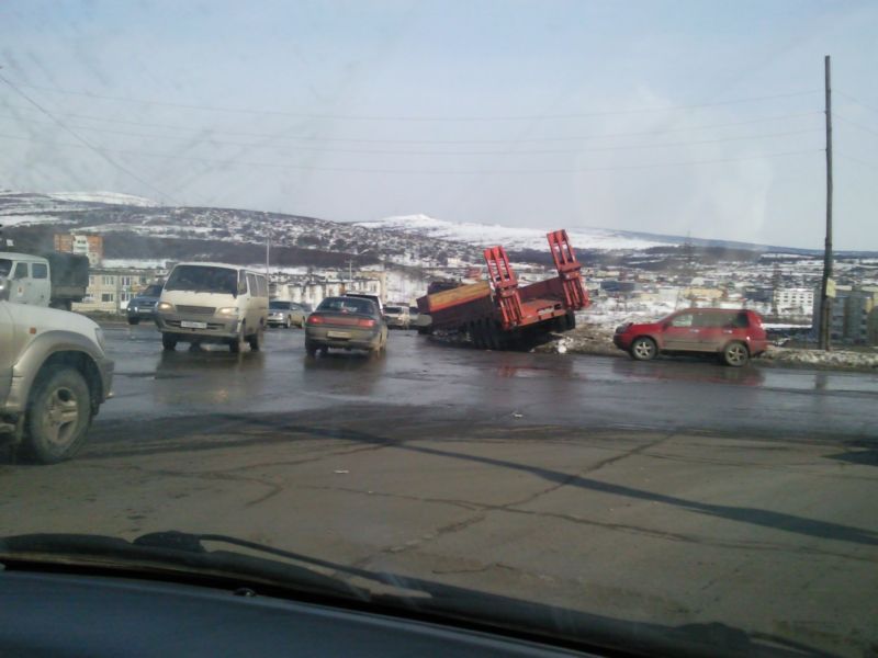 На перекрестке Кольцевая - Пролетарская Камаз с длинным пустым прицепом видимо не рассчитал и не вошел в поворот, прицеп задними колесами залез на сугроб, передней частью лежал на асфальте. Вечером фотку скину