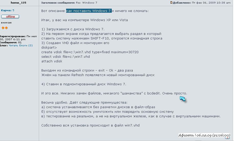 Спасибо тебе за тот мануал на фото. Всё просто и понятно. Я спецом не текстом послал чисто а с фотографией поста форума? Ну - страна же должна знать героев и понично ? Как-бы? By dissector А вот це уже и - дело! Помочь женщине? А ставить можно же в любое место? Там просто пишешь букву диска, на котором создашь виртуальный? Т.е. к С оно не привязано собстна. Я пробовал когда посмотреть на новое хотелось. Там хоть и бетка была - норме она работала и кто не в курсе как стоит - там по работе не определишь. А вот лайф СД и на вирт. машине - там есть много ограничений. По крайней мере в моей машине не определяется моё видео и ещё часть устройств. При установке на диск .vhd таких проблемм не замечено. ============================== Ну - удачи! Сообщение отредактировал Volk - 14.5.2011, 21:46 |