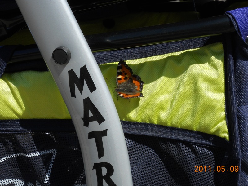 Сегодня, когда ходили с женой в парк, на коляску села вот такая бабочка (решила "зайцем" покататься)