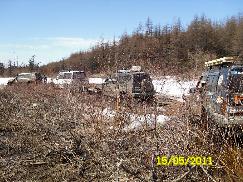 Ещё негоже в поездках пить. Алкоголь притупляет чувство страха, реакцию. Пьяный человек некорректно соображает, не может принимать сложные решения. А ещё после него остается мусор. Вот таким необычным способом я пропустил скучные вступления как мы собирались и ехали на Олу, чтобы пробиться к озеру Чистое. Хотя пару пунктов нужно. Вот например я порвал болотные сапоги и не успевал надыбать новые, но вооруженные силы РФ спасли меня... Mik подогнал чулки от ОЗК. Однако в армии по всей видимости не подозревают о существовании ног 46 и более размера. Короче они мне были малы. И не было подвязок и клипсов. Короче ходил я как бомж. Плюс они постоянно с меня спадали. Ну да ладно, не в Париже на показе мод ведь. Решили для начала попробовать через Атарганский перевал. Уперлись в снег, который покрывал весь перевал. Оказалось, что мы не единственные, кто в него уперся. На месте уже активно отдыхали со всеми втекающими последствиями экипаж Бешеного эскудо и синий Близзард. Попробовали подняться в перевал... получается по-тихоньку. Самая большая проблема - тысяча советов, которые сыплются со всех сторон. Фраза "Помолчите, б*ь, пожайлуста" помогают ровно на 1.5 минуты (засекал). Эскудики бы проскочили, но вот тяжелые Сафари скорее всего начали валиться бы в сугробы. Порешали, что мы слишком ранимые душой для такого тяжелого и жесткого порно, так что развернулись на 180 градусов и решили возвращаться на развилку. По пути трещали по рации о том, что Задница едет впервые и необходимо его все-таки посвятить в джиперы. Так как у Задницы рации нет, то он нас не слышал и мы ислагали самые немыслимые варианты. Методов посвящения было предложено много, все они разнились, но все подводили к одному - он бы осталься ОЧЕНЬ грязным. Правда к конценсусу мы так и не пришли. Пока разворачивались бешеные эскдики и Близзард уже закинули своё барахло в машины и, раскидывая содержимое багажника по лесу, уже катались туда-сюда под разными углами к направлению дороги. Предложили им драть вперед "А мы дороги не знаем".... ну тогда следуйте за нами. За нами - это тоже значит туда-сюда.... не поймешь их. Возвращемся к развилке... Машина кренится на левый бокк.. хм. Логическое решение нашли сразу: правые колеса спускал Mik, левые - я. Ну спустил так спустил. Подключенный к левым колесам манометр показал ровный ноль. Даже стрелка не дернулась... ну что, я - душа щедрая, весь воздух атмосфере отдал. Ну а что? Возим его с собой, лишний груз только, вон из колеса. Кстати о девочках... Наша канистра активно текла и Mik все время поглядывал в зеркало салонное и подмигивал... пришлось останавливаться и высаживать девок у ближайшего дерева. Девочки сопротивлялись и предлагали оплатить проезд натурой! Но у нас есть цель. Миша вообще женат, нефиг. Упаковали канистру и девочки отстали. Вернулись на развилку и двинулись по направлению к Ланковой. Поля подмороженные, но веселья выхватили. Уже через 2 недели народ будет сидеть. В речке ещё лед кое-где. Я ради интереса дезертировал в Пырзик к Заднице. Мы добрались до ямки... выехали на лед, а съехать негде!!! Я пошел искать дорогу, а Задница уже направился к краю ледового панциря. Машинка стоит, а под ним вода течет! КРичу, машину, а он, оказывается, уже сам все знает. А потом случилось как в мультике. Лед обвалился, а машина ещё мнговение висле в воздухе, потом с таким "быыыыдыыыыыыыы