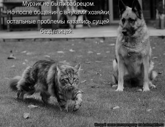 Решила выпустить его на 15 минут - раз котику так гулять охота. Через минуту кот вернулся... ... с филином. У филина размах крыльев на полкомнаты, и как раз полкомнаты они и обрушили за первую минуту. Кот рычал как собака и шипел, не разжимая зубов, филин орал нечеловеческим голосом. Через некоторое время филин вырвался из лап и зубов, улетел в темный коридор, сел там на вешалку, и сказал: "У-у!" Принесла я в темноте стульчик, взяла полотенце. Кот меня со стула сталкивает, приговаривая, что "Принесла мне стульчик - вот и хорошо! Уйди теперь отсюда! Сам достану!" Чуть не убившись поймала филина в полотенце. И что вы думаете - кто-нибудь сказал мне спасибо за спасение несчастной птичьей души? Кот меня бил по ногам, филин щипал за руки, и яростно откусывал куски от полотенца. Обругали меня последними словами оба. Потом мы некоторое время махали филину лапкой вслед... А я, проснувшись утром, первым делом пылесосила полчаса. Да-да, наш любимый промышленный пылесос. Сейчас вот сижу, пишу, а рядом на столе сидит кисинька, трется мордой, прикладывается к моему плечу и мурлыкает. Как будто не этот кот вчера убивал меня же. Сволочь белая. :-) -------------------- Нормальные девушки сидят "по стойке смирно", судорожно вцепившись в руль, олицетворяя своим видом механика-водителя танка, идущего в атаку. На лице - ярая бдительность агента КГБ времён холодной войны (искоса бросаемые по сторонам короткие, но пристальные взгляды, типа "на чью мельницу воду льёшь, гражданин, а?")... (С) jey |