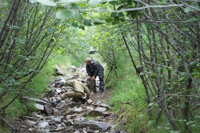 Спасибо Руслану(страннику) за обед! иначе пришлось бы жиперов грабить Фотографы повстречали на обратном пути мишку и вернулись, и я, не имея планов оставаться на ночь, привязался хвостом к быстро сколоченной компании с ружьём, бодро вышагивая в целях расчищения пути от медведов! Ой да ладно,мы мотиками всех медведов распугали |