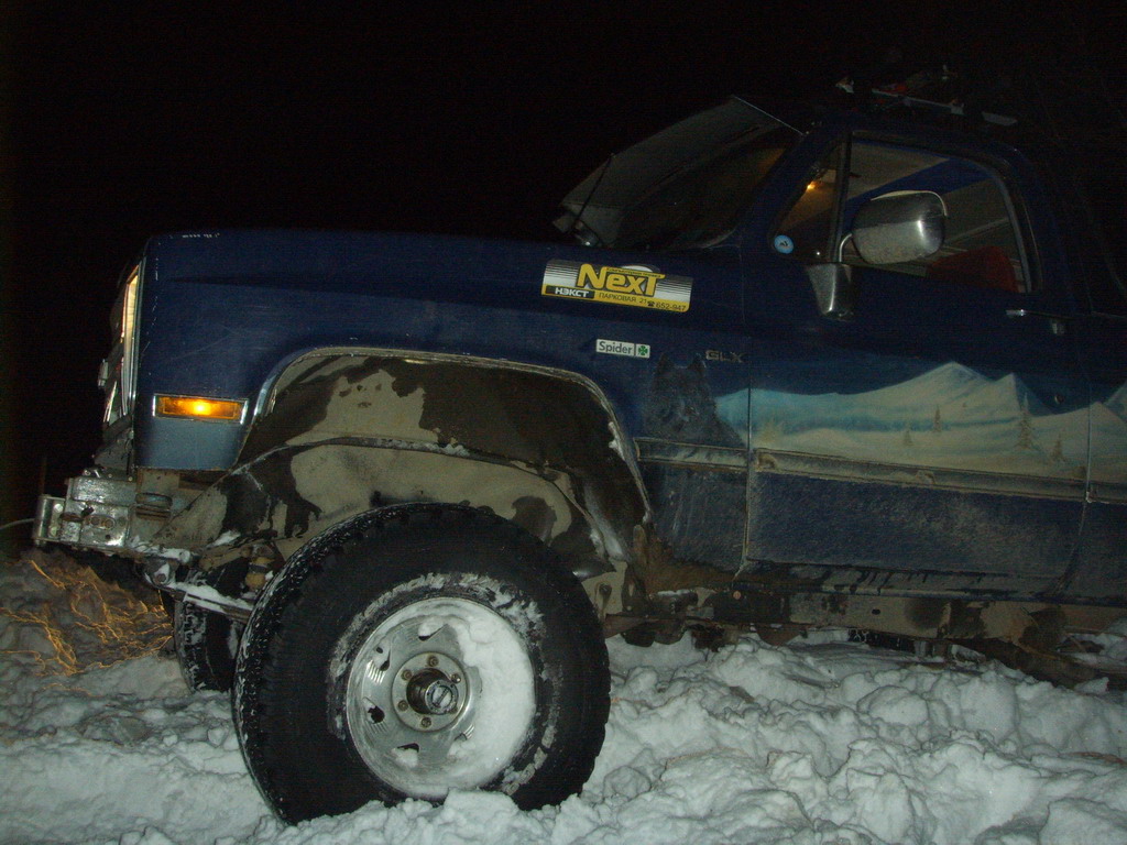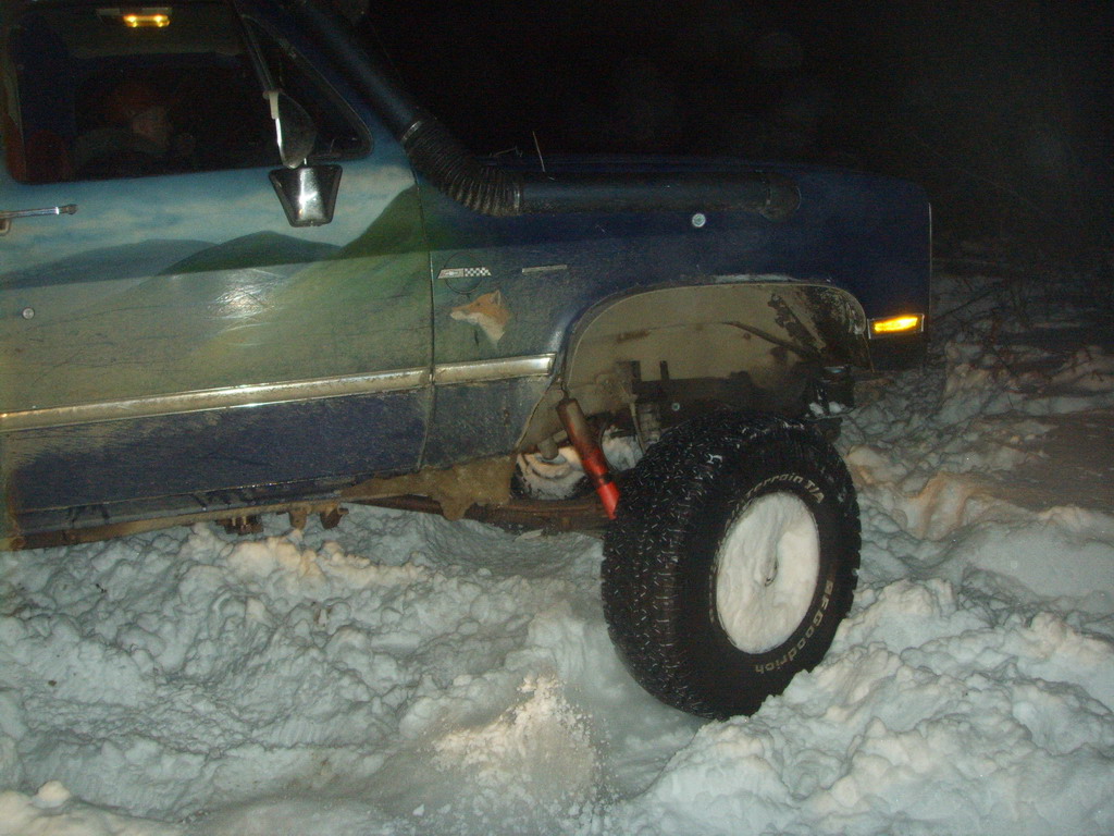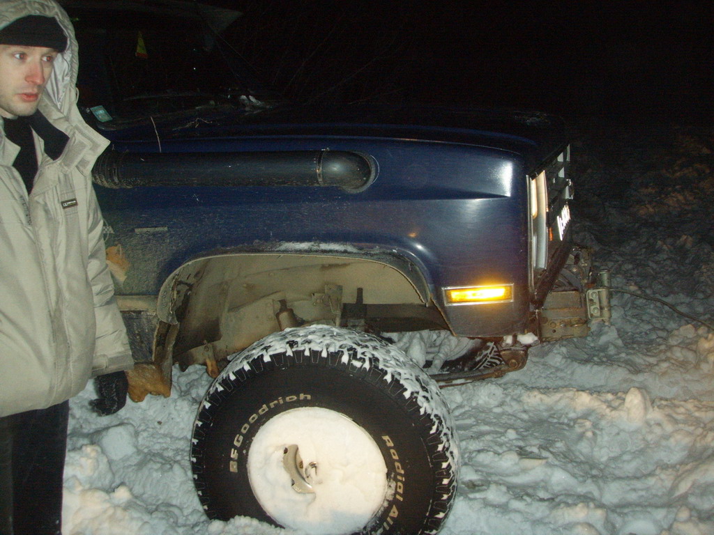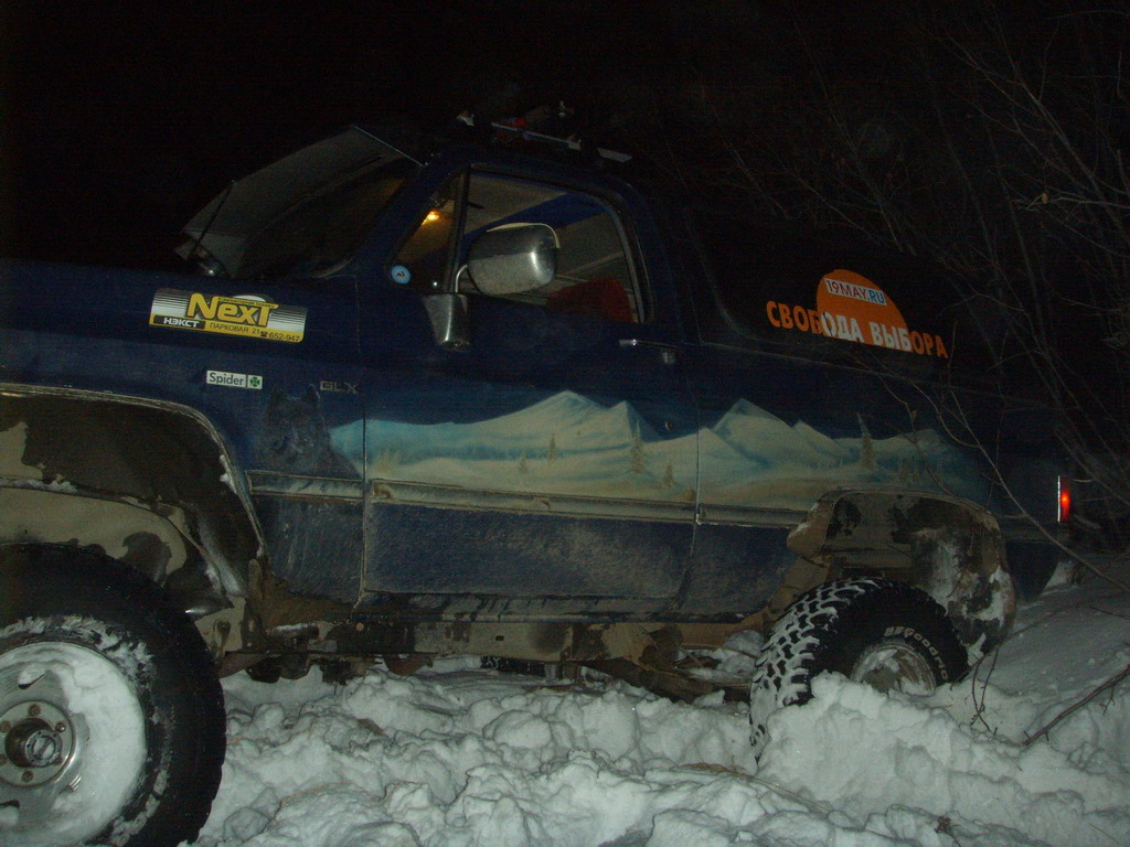шевроле немного спустился патмо на лебедке пришлось разварачиваца и назад на неи же возращаца паджер тоже павошкался и уехал пузотекри выехали спомощью рук и лопат а по там же прямая дорога а по прямои мы лихо бежим там она прямая.. но я себе бампер умудрился помять.. когда ехал по лету.. причем ехал трезвый.. просто ехал.. вы подумйте ... что здесь вы просто ехали по ровной дорогге засыпанной снегом (вернее, токлаись).. а там будет толкать машину через валуны... %) |