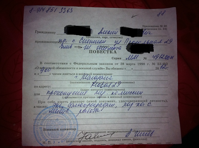 Не хочу открывать новой темы, ситуация такая:30,04,12 Звонок в дверь, я в глазок - там молоденькая девушка с еще одной но уже никак не девушкой. Ну я думаю соцопрос какой нить, открыл дверь, в трусах естественно, а мне мол оденьтесь молодой человек. Ну я оделся и вышел. Мы мол из военкомата, распишитесь в повесточке пожалуйста =((( Во попал. На словах сказали 02,05,12 явиться в военкомат, да и в отрывном талоне, который они себе оставили была эта дата. а по факту смотрим фото. Мож ну его на, а? на мед. комиссию сходи, че такого то... дальше, больше...) не верь никому -------------------- алабама