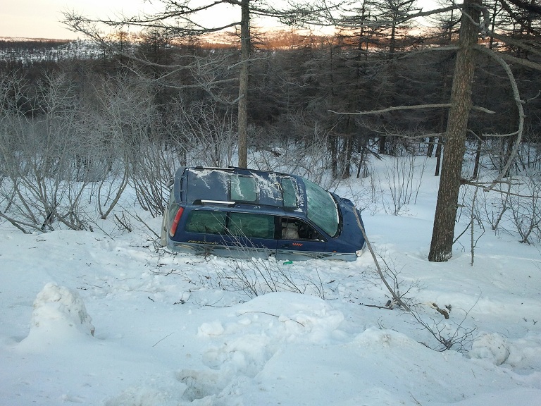 Ещё одна история. Так же 1 января еду в сторону Олы. Первый затяжной подъём. Иду 50-60 ио тут мены начинает резко швырять на встречку, благо никого небыло. Бросаю газ выравниваюсь и станавливаюсь у обочины на встречной полосе. Тронуться немогу шлифует задний привод. Вышел из машины и упал)), свиду асфальт оказался сплошным катком со льдом 2-3см. С горем пополам начал скатываться задом и случайно увидел такое чудо в кустах. В машине никого небыло открыта т.к. окна разлетелись, видно что такси. А вдруг пассажиров вёз и они "того", закопаны в снегу, а сам скрылся. Мож кто подробности знает.