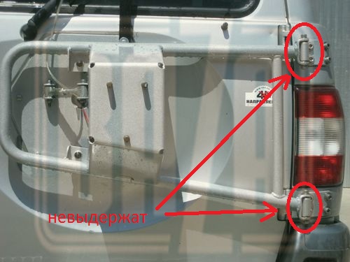 по креплению колеса запасного- там же еще тяга эта короткая. как я понял она перераспределяет часть нагрузки от рычага на дверь. и тогда у этой конструкции 5 точек ( 3 стандартных на двери + 2 новых на трубах)
