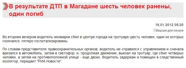 uvdmagadan.ru:"Вечером 17 января 31-летний водитель автомобиля «Сузуки Гранд Витара», двигаясь по улице Портовой в сторону проспекта Ленина, потерял контроль за движением транспортного средства и, не справившись с управлением, съехал с проезжей части с последующим наездом на опору светофора, после этого сбил четверых пешеходов, находящихся на тротуаре, затем пересек проезжую часть проспекта Ленина и совершил наезд еще на двоих пешеходов, находящихся на тротуаре около проезжей части. В результате ДТП один из пешеходов, 28-летний житель областного центра, от полученных травм скончался на месте, остальные с травмами различной степени тяжести госпитализированы в Магаданскую областную больницу."