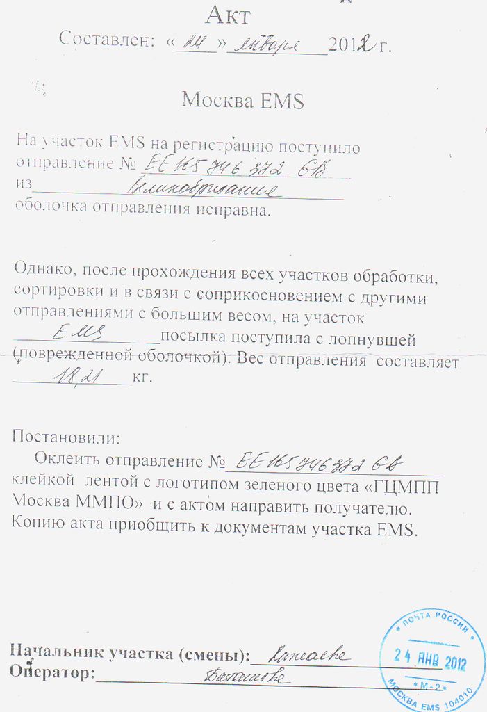 "Российская Почта — филиал ада на земле. Ад — это отделение Российской Почты. не так: Дьявол в отделених почты России особенно силён! Дьявол в отделениях Почты России теряется и иногда плачет от бессильной зависти." Пришли получать коробку размером 1,6*0,8*0,3 метра, весом 18,21 кг (да, немаленькое такое отправление). Нас честно предупредили, что мол, припадками не страдаете, - ваша коробка пришла с повреждениями. Ну, грим, пошли смотреть до получения. Проходим - а там реально дыры в картоне, механизмы наружу и все это прихвачено скотчем, что бы в куче хоть пришло. Проверили, слава богу фатальных повреждений не выявили, расписались в получении (ну очень не хотелось товарищу от нее отказываться и обратно отправлять). Только благодаря дополнительной упаковке (сверх заводской) продавца, ПР не угондошила международное отправление. Выдержка из акта: "После прохождения всех участков обработки, сортировки и в связи с соприкосновением с другими отправлениями с большим весом, на участок EMS посылка поступила с лопнушей (поврежденной) оболочкой...". Это что же это там за "дискотеки" устраивают, что затёрли коробас больше чем полтора метра размером и весом в 20кг?! Клиент, в итоге, отделался переживаниями и потертой краской на некоторых узлах... И кстати, от Москвы до выдачи вМагадане прошло 39 дней. Вот такой наш суровый ЕМС. Сообщение отредактировал tpavel - 2.3.2012, 14:39 Спасибо! — maldyak