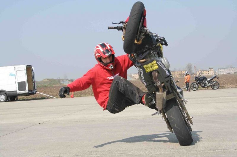 Свое название этот экстремальный вид спорта получил от английских слов — stunt (в переводе «трюк») и ride («езда»). Считается, что стантрайдеры впервые появились в Англии в 80-х годах ХХ века. Хотя если подумать то как только переднее колесо мотоцикла впервые оторвалось от земли, в этот момент и родился стантрайдинг.. И так стантрайдинг это трюковая езда на мотоцикле, понятие конечно довольно широкое, но стант и есть вид спорта без ограничен практически. Единственное неверно можно провести линию между мото фристайлом и стантрайдингом. Во фристайле все самое интересное происходит в воздухе , в то время как в станте вообше не используется никаких дополнительных приспособлений, ни трамплинов ни рамп, только ты твой мотоцикл и дорога, следовательно стантрайдингом можно заниматься где угодно и даже не важно есть ли там асфальт.. Тип мотоцикла также не принципиален, можно использовать любой, который есть под руками, люди даже на скутерах гоняют.. Ну единственное только чепер наверное не подойдет, хотя можно конечно попробовать управляемый занос. Но профессионалы обычно отдают предпочтение 600 кубовым спортбайкам, во первых у них наиболее удачное для стантрайдинга соотношение мощности и веса, во вторых выглядят они и звучат более эффектно чем например эндуро. Хотя сам стантрайдинг появился за долго до того, как было придумано это слово выделять его в отдельный вид спорта стали сравнительно недавно. В начале 1990-х годов прошел первый чемпионат мира по стантрайдингу. Его участники демонстрировали самые непредсказуемые приемы вождения мотоцикла. К примеру, Крейг Джонс – первый, кто «сел на руль» (залез на бензобак), перекинув ноги через руль и поехав на заднем колесе. В стантрайдинге, как и в фигурном катании, большую важность и почетность имеют новые элементы, нежели повторение старых, так как набор возможностей ограничен — ведь у мотоцикла лишь два колеса. Трюки на мотоциклах со временем все больше усложнялись. Говорят, что настоящая трюковая езда началась, когда стантрайдеры перестали пользоваться ручкой газа, другими словами «накручивали» холостые обороты, придерживая мотоцикл лишь с помощью тормоза. Так райдеры получили возможность ездить на мотоцикле без помощи рук. Первым, кто это сделал, был бразилец А.К. Фариаш, ставший чемпионом мира по стантрайдингу. Новые трюки придумываются людьми по всему миру постоянно но за частую это уже просто комбинация нескольких трюков придуманных раньше, это не делает их проще, даже наоборот, начинающим райдерам становится все сложнее влиться в эту струю, трюки становятся все сложнее и опаснее, и чем то простым уже никого не удивишь, а учится все равно приходится начиная с простого.. Несколько трюков для начала... Wheelie (вилли) или Руководство по езде на заднем колесе Источник: www.stuntlife.com Для начала необходимо сказать, что всё изложенное здесь является моим личным опытом и опытом других моих знакомых стантрайдеров. Следование следующим советам не поможет вам избежать падений, вывихов, растяжений или даже переломов, но все таки это будет более безопасно, чем если бы вы обучались этому сами. Подготовка байка к езде на заднем колесе. Масло: Много байков страдает масляным голоданием при длительных прохватах на заднем колесе и постановке байка на 12 часов с заведенным двигателем.. Особенно известны этим Джикс