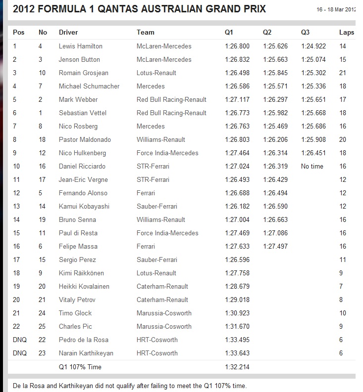 Pos No Driver Team Time/Retired Gap Laps 1 7 Michael Schumacher Mercedes 1:29.183 16 2 12 Nico Hulkenberg Force India-Mercedes 1:29.292 0.109 19 3 15 Sergio Perez Sauber-Ferrari 1:30.199 1.016 23 4 5 Fernando Alonso Ferrari 1:30.341 1.158 13 5 14 Kamui Kobayashi Sauber-Ferrari 1:30.709 1.526 14 6 11 Paul di Resta Force India-Mercedes 1:31.466 2.283 13 7 6 Felipe Massa Ferrari 1:31.505 2.322 14 8 20 Heikki Kovalainen Caterham-Renault 1:31.932 2.749 16 9 8 Nico Rosberg Mercedes 1:32.184 3.001 17 10 1 Sebastian Vettel Red Bull Racing-Renault 1:32.194 3.011 19 11 2 Mark Webber Red Bull Racing-Renault 1:32.296 3.113 20 12 24 Timo Glock Marussia-Cosworth 1:32.632 3.449 17 13 21 Vitaly Petrov Caterham-Renault 1:32.767 3.584 15 14 10 Romain Grosjean Lotus-Renault 1:32.822 3.639 11 15 3 Jenson Button McLaren-Mercedes 1:33.039 3.856 18 16 4 Lewis Hamilton McLaren-Mercedes 1:33.252 4.069 11 17 18 Pastor Maldonado Williams-Renault 1:34.108 4.925 21 18 9 Kimi Räikkönen Lotus-Renault 1:34.275 5.092 7 19 19 Bruno Senna Williams-Renault 1:34.312 5.129 17 20 17 Jean-Eric Vergne STR-Ferrari 1:34.485 5.302 29 21 16 Daniel Ricciardo STR-Ferrari 1:34.604 5.421 31 22 25 Charles Pic Marussia-Cosworth 1:34.770 5.587 13 23 23 Narain Karthikeyan HRT-Cosworth 1:42.627 13.444 16 24 22 Pedro de la Rosa HRT-Cosworth No time 1 -------------------- (964) 459-792-девять Дмитрий, адвокат