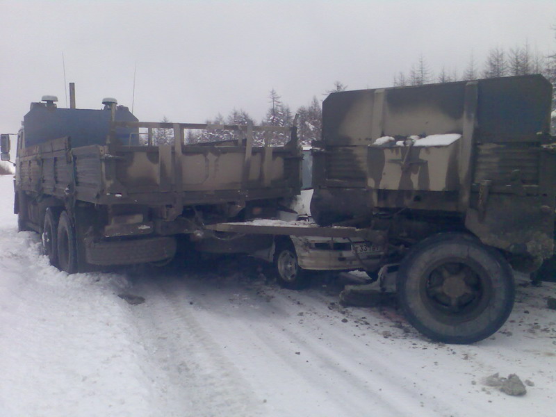 Ольский перевал. Около 12 часов дня. Камаз сложился, хайс не смог оттормозиться. Очень скользкая непосыпанная дорога- лёд, накатанный снег.