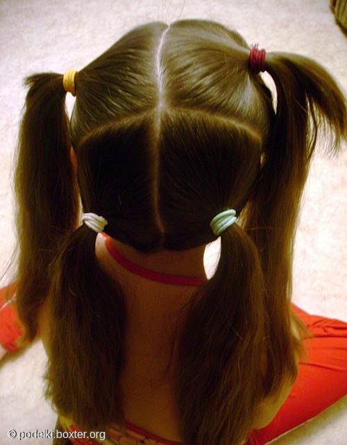 Как делаем эту прическу: Разделяем волосы на две части,ровненько, и плетем косы "наоборот", выпуская петли только с внешнейстороны через три-четыре перекида. На каждый перекид делаем подбор с обеихсторон. Так плетем до конца, оставляя хвост, закрепляя резинкой. Выпускатьпетли с одной стороны нужно до конца плетения. То же проделываем с другойстороны. Косы плетем поближе к пробору, иначе шнуровка получится слишкомширокая. Стараемся плести равномерно, чтобы было одинаковое количествоперекидов на обеих косах. Закрепляем две косы в один хвост. Резинку нужно братьв цвет ленточки, чтобы ее не было видно. Теперь делаем шнуровку. Берем шпилькуи ленточку. Круглый конец шпильки продеваем с внешней стороны подневытянутый перекид (тот, что ближе кпробору), в образовавшуюся петлю-шпильку продеваем нашу ленточку и вытягиваемшпильку из косы, протягивая ленту через перекид. То же делаем с другой стороны.Так "шнуруем" до конца, перевязываем резинку и завязываем симпатичныйбантик. Любуемся и хвалим себя) Сообщение отредактировал yuli - 10.5.2012, 7:15 -------------------- Стерилизуйте дворовых и домашних любимцев!