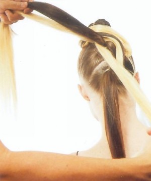 Необходимые инструменты для создания прически: однаили две длинных накладных пряди, утюжок, три резинки для волос, одна заколка,шпильки, лак, семь расчесок с острыми концами. Эта вечерняя прическа на длинные волосы своими руками,подойдет для любого торжественного случая, будь то свадьба, выпускной,вечеринка по случаю дня рождения или любой другой праздник. Прическа совершенно потрясающая, выглядиточень стильно и оригинально, при этом, очень простая в создании, хотя, глядя наконечный результат, так не скажешь. При создании этой прически используютсянакладные пряди одного или двух различных цветов, немного или кардинальноотличающихся от вашего собственного оттенка волос. В данном случае на волосахмодели, которые имеют медно-русый цвет, применялась прядь светло-золотистогоцвета. Варианты могут быть различными. Например, если вы хотите создать яркуюэкстравагантную прическу, вы можете применить пряди ярких кислотных цветов:красного, синего, фиолетового, розового – все зависит от вашей фантазии. Есливы более склоняетесь к созданию классического традиционного образа, используйтепряди, оттенок которых наиболее близко гармонирует с вашим естественным цветомволос. 1. Недостаточно гладкие и прямые волосы разгладьте утюжком,после чего разделите на четыре части, как это показано на фото. Верхнюю частьволос закрепите заколкой, а три остальные соберите резинками. Чтобы волосы неэлектризовались и не разлетались, сбрызните их спреем. Далее возьмите прядьдругого цвета, и область середины ее приложите к верхнему хвосту. Обмотав этупрядь вокруг хвоста, закрепите ее у основания при помощи резинки. Хвост изнатуральных волос обработайте лаком, так, чтобы он стал пластичным, после чегонатяните его в сторону лба, на палец, и скатайте в конус. Полученный конусзакрепите у снования хвоста при помощи шпильки. Далее работаем со светлойпрядью волос. Делим ее на четыре части, первую из них обрабатываем лаком дляволос, так, чтобы она стала пластичной. Возьмите первую прядь и обмотайте ееодин раз вокруг конуса, и, возвратившись к исходной точке, закрепите прядь припомощи гребня с безопасным острием на конце, после чего обмотайте прядь вокругпальца, и полученное колечко закрепите при помощи второго такого же гребня. Унас получилась плоская «шестерка», закрепленная гребнями. Теперь, чтобы она не развалилась, еенеобходимо аккуратно закрепить шпильками, после чего гребни можно будет убрать.Отлично. Идем дальше. 2. Разделите средний хвост на две части, как это показано нафото, и соедините правую из них со второй светлой прядью. Расчешите прядирасческой, и обработайте их лаком. Полученная прядь, состоящая из натуральных инакладных волос, должна получиться плотной и упругой. Эту прядь необходимопротянуть вправо, и, создав петлю, закрепить ее противоположным концом гребня.Далее эту прядь нужно протянуть вверх, к созданному ранее «колечку», изакрепить ее вторым гребнем. Оставшийся кончик обматывается вокруг верхнегоконуса, и закрепляется при помощи шпильки к его середине. После этого петлю,которая крепится гребнями, можно закрепить шпильками. Гребни убрать. 3. Теперь мы берем вторую прядь из среднего и третью изверхнего хвостов, соединяем их и пока убираем в сторону. Четвертую прядь изверхнего хвоста соединяем с нижним хвостом, расчесываем их и обраб