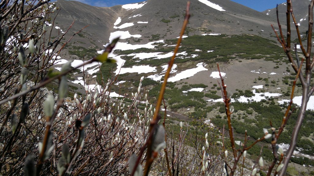 Ручьи переходить не пришлось. Всю дорогу сухо. Подъём постепенный, во многих местах можно идти по старым бульдозерным колеям, без значительных перепадов. Крутой склон был только в одном месте. Большую часть прошли по вершинам и гребням. Чего и вам желаю. Аккуратно на склонах-местами камни "плывут". Камнеупорная обувь - обязательна, а так же бутылки для питьевой воды. речка при входе. вверху - снежники. ждя перекуса по дороге лучше взять термосы, с дровами наверху проблема. 10-го будем так же в районе Карамкена. вероятно пересечёмся. Вперёд, по гребню козьими тропами (то есть бараньими) В самых тихих местах - уже цветение. Вот она! обратный путь был тоже по гребню. ноне у всех. нам нужно было забрать ставшие лишними и оставленные на подъёме резиновые сапоги, а часть группы спустилась по распадку до старой дороги - и к трассе, где и была подобрана позже. скоростной спуск на попах и рюкзаках - быстро, весело, мокро -------------------- Для бешеной собаки пятнадцать километров - не крюк...