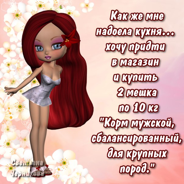 -Милый я скинула 2 килограмма! -Молодец, смыть не забудь! *** Закинул старик в море невод, а оттуда голос: -сеть не доступна! *** Если бы ходьба была бы полезна для здоровья, почтальйон был бы бессмертен) *** Почему блондинки, когда пьют таблетки, пищат? потому что на упаковке написано: "После приема пищи *** Некоторые мужчины в постели так же бесполезны, как Я наэкзамене по алгебре! *** Сегодня положила кому-то ошибочно 200 рублей на телефон.. Посмотрела на номер и, чтоб не обидно было, отправила вдогонку смс: "За шикарный секс!") *** - Вова как твоя фамилия? - Марья Степановна, моя фамилия символизирует то что выкаждый день берете в рот! - Не дерзи мне Ху@в! - Вообще-то я Ложкин =D *** Хорошо когда можешь похвастаться как ты круто провел выходные,но когда ты не можешь рассказать как выходные прошли потому что не помнишь -тогда они прошли еще круче!!) Сообщение отредактировал yuli - 6.8.2012, 13:27 -------------------- Стерилизуйте дворовых и домашних любимцев!