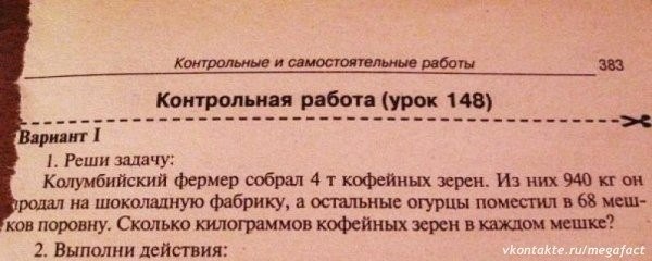 С баша: Еду на автобусе с работы домой. Рядом очень радостно, громко и эмоционально молдой отец обучает молодого сына арифметике, рисуя примеры пальцем по запотевшему стеклу и выдумывая задачи. Через пятнадцать минут упражнений начинается следующий текст: О: Граф Дракон полетел в одну деревню и скушал там пять мирных житлелей, потом он полетел в другую деревню и скушал там пять мирных жителей. Сколько жителей он скушал? С (загибая пальцы): Десять! О: Правильно. Но вот один житель недопереварился, вылез из живота, в общем, в зубах застрял. Сколько осталось жителей в животе у Дракона? С: Девять О: Так. Потом он полете в другую деревню и съел там три мирных жителя. Сколько стало в животе? С: А в этот раз никто не спасся? О: Нет, съел всю деревню. С: трин... нет, двенадцать! О: Потом появился Добрыня Никитич и вспорол Дракону брюхо, и выпустил оттуда семь мирных жителей... С: Уууууу, я так с тобой не дружу! О (исправляясь): ...И зашил! Зашил брюхо! Сколько осталось людей в животе? С: ноль. О: нет он же только пять жителей выпустил. С: а, семь! О: А в это время люди в животе "не скучали", и у них появилось два ребёнка. С: У каждого? О: Нет только два. Сколько людей стало в животе у Дракона? С: Девять! -------------------- Самый надёжный план: -Фигня! На месте разберёмся!!!