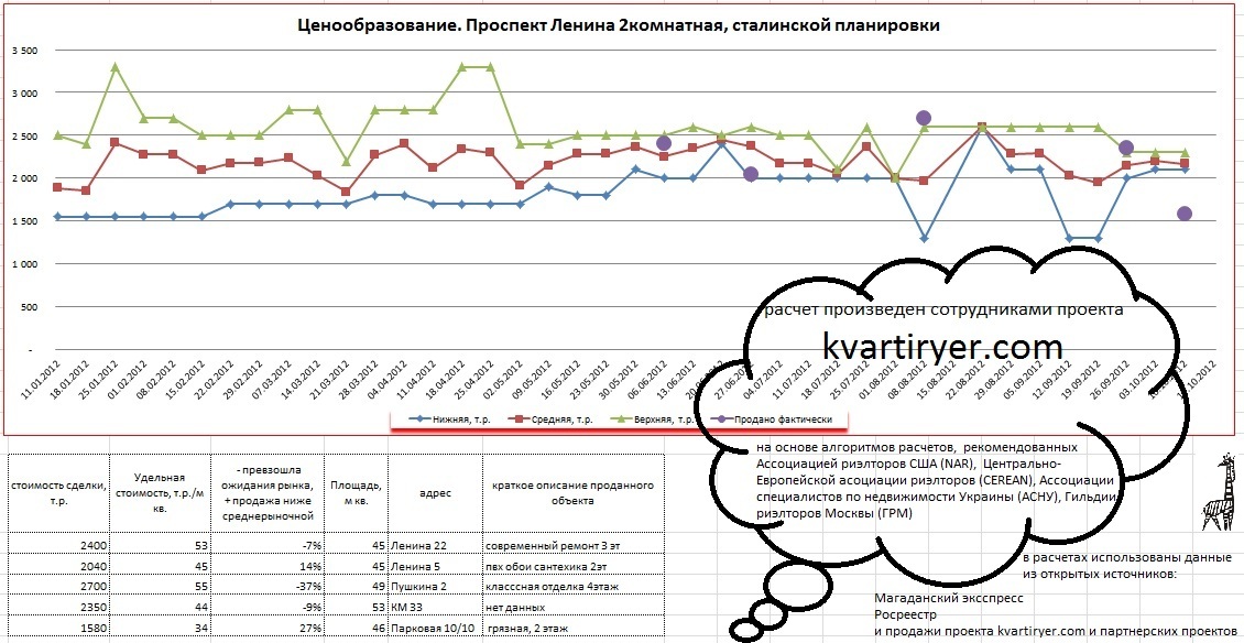 Факт. стоимость как-то не согласуется со "среднерыночной", поэтому ещё вопрос: какие коэффициенты применяете для учёта инд. особенностей "товара", их градиенты и вес? P.S. "Среднюю", по обыкновению, принято показывать линией трэнда, тем паче в Екселевской диаграмме. Данные экспозиции продаваемых объекктов почерпнуты из открытых источников - любезно предоставлены редакцией Магаданского экспресса. Верх и низ - самые дорогие и самые дешевые предложения аналогов. Изучая стоимость объектов, неблагодарное дело исследовать спрос. Кому то бисер мелок, а кому щи пустые. Реальные продажи также есть в открытых источниках Росреестра. Накладывая точки продаж можем построить предположение о коридоре стоимости, по которой объект будет продан. Обычно при подписании контракта с клиентом, оговариваем 4-5% коридор стоимости. Коэффициенты характерны для базисно-индексного метода оценки. Здесь использован сравнительный метод. На forum.ners.ru упомянутые вами коэффициенты применимые к 100% аналогам (район, этаж, вид с окон, соседи - геопараметры) порой обсуждаются. Коэффициенты разнятся 10-25% от Ср Рын по аналогам. Своего обоснованного мнения на этот счет не сформировал. Но покупая квартиру для последующей сдачи в найм тысяч за 30-37, я стану смотреть на квартиры представительского класса. Ибо рентабельность таких приобретений от сдачи будет выше, чем при покупке "бичаренки по дешевочке" и сдаче ее соответсвующему контингенту за 12-14т.р. P.S. Как горшок не назови, лишь бы в печь лез На десерт выкладываю ценообразование 2комнатной хрущовской планировки, поступившей к нам на продажу нынешним вечером -------------------- Профессиональные посреднические услуги по продаже и аренде недвижимости. 89248 512 512 kvartiryer.com